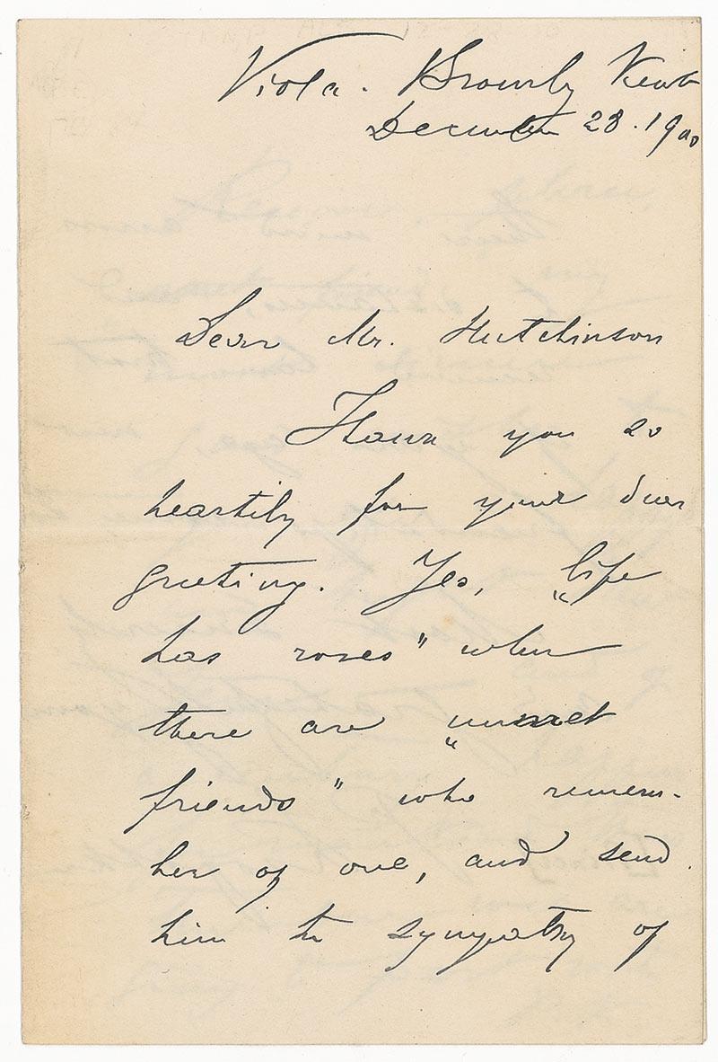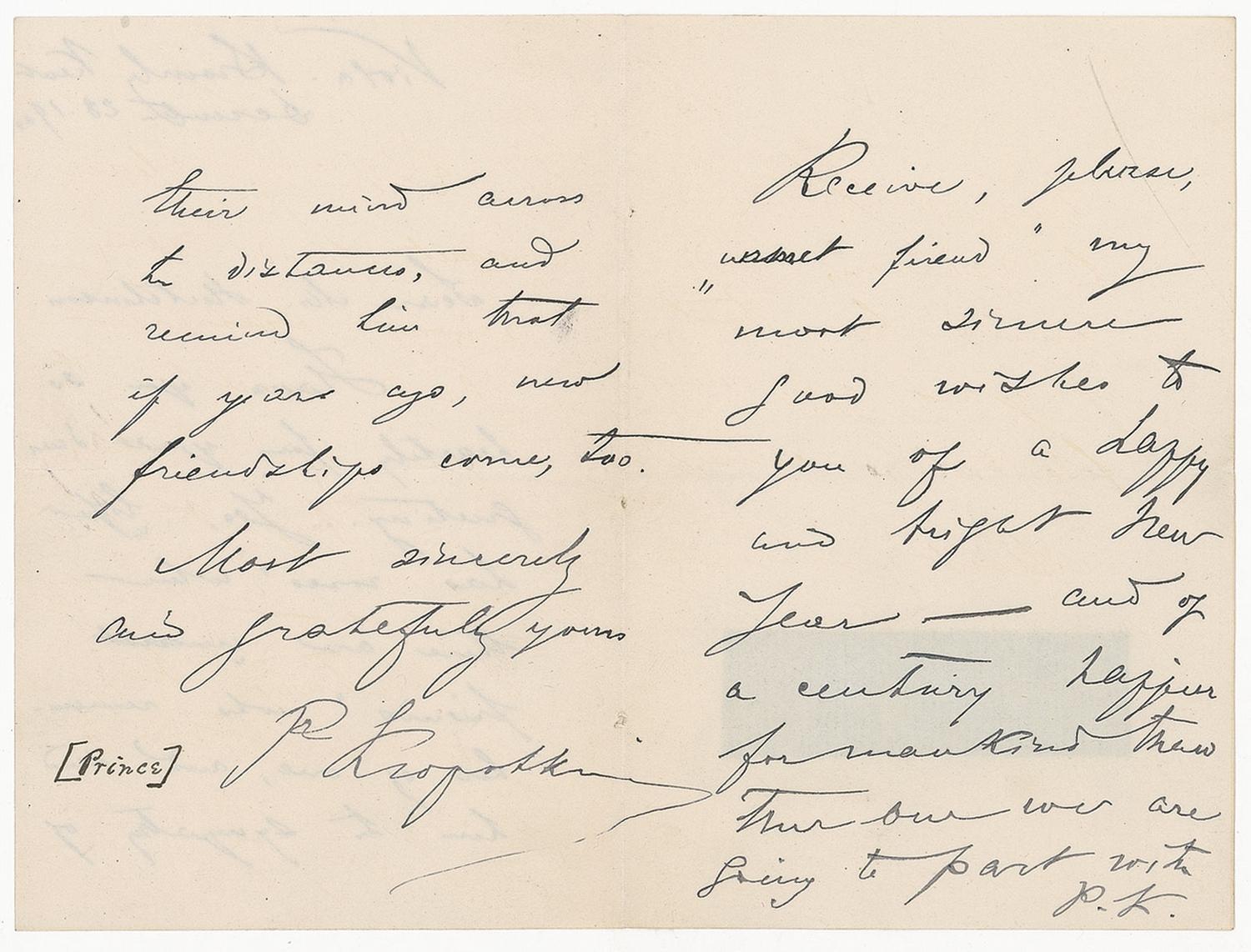 Russian geographer, zoologist, and political theorist (1842–1921) best known for his advocacy of anarchist communism. ALS signed “P. Kropotkin,” three pages on two adjoining sheets, 3.5 x 5.5, December 28, 1900. Letter to Mr. Hutchinson. In part: “Thank you so heartily for your dear greeting. Yes, ‘life has roses’ when there are ‘unmet friends’ who remember of one and send him the sympathy of their mind across the distances...” Kropotkin also adds a postscript on the final page of the letter, signed “P.K.,” sending New Year’s wishes “of a century happier for mankind than the one we are going to part with.” In fine condition, with an old dealer’s label affixed to back of second page.