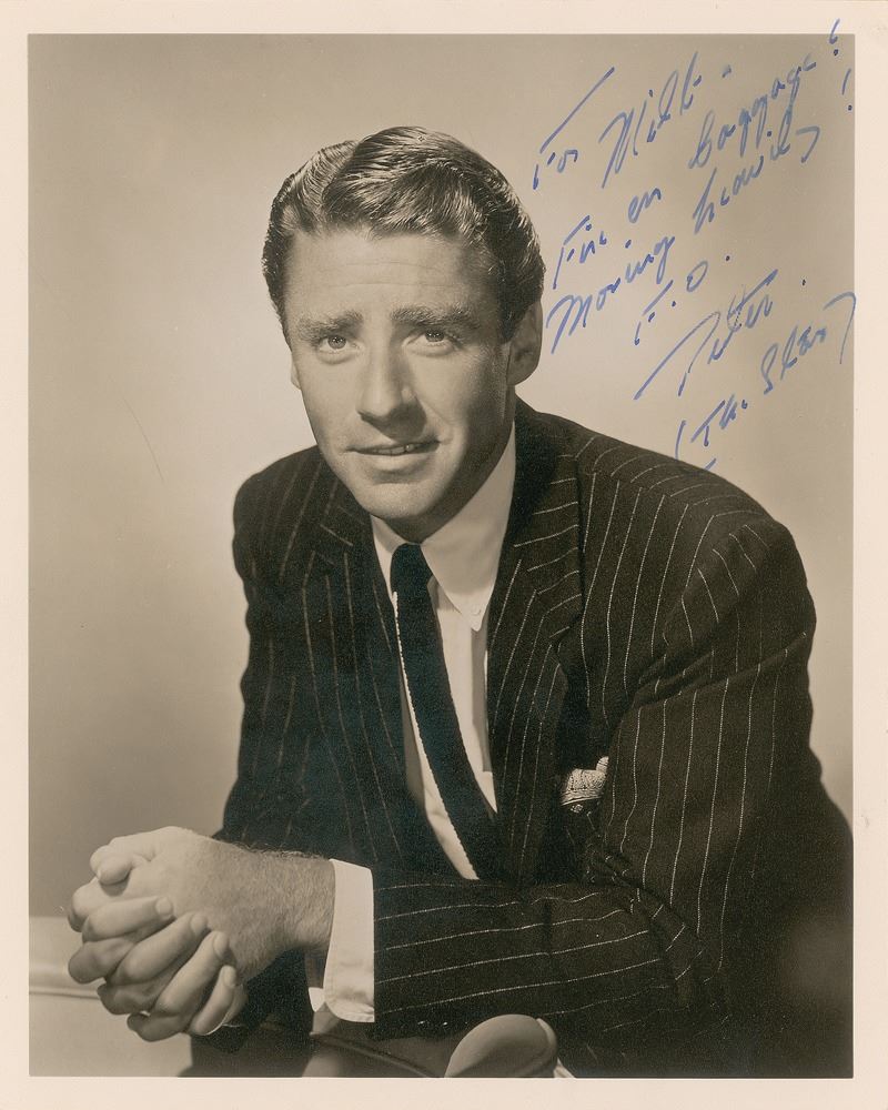 Handsome matte-finish 8 x 10 portrait of Lawford in a dashing pinstriped suit and tie, boldly signed and inscribed in fountain pen to his friend and manager Milton Ebbins, "For Milt--Fine on baggage! Moving heavily! F. O., Peter, (The Star)." In fine condition.