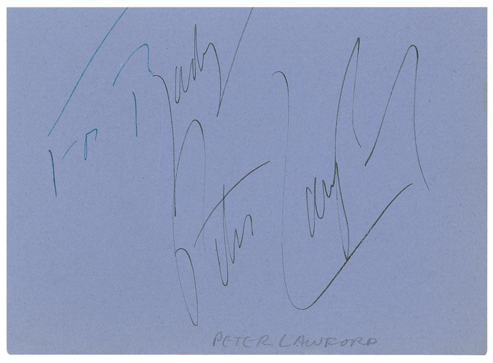 Vintage ink signature and inscription, “For Rudy, Peter Lawford,” on a blue 5.5 x 4 album page. In fine condition, with Lawford switching pens after beginning of inscription.