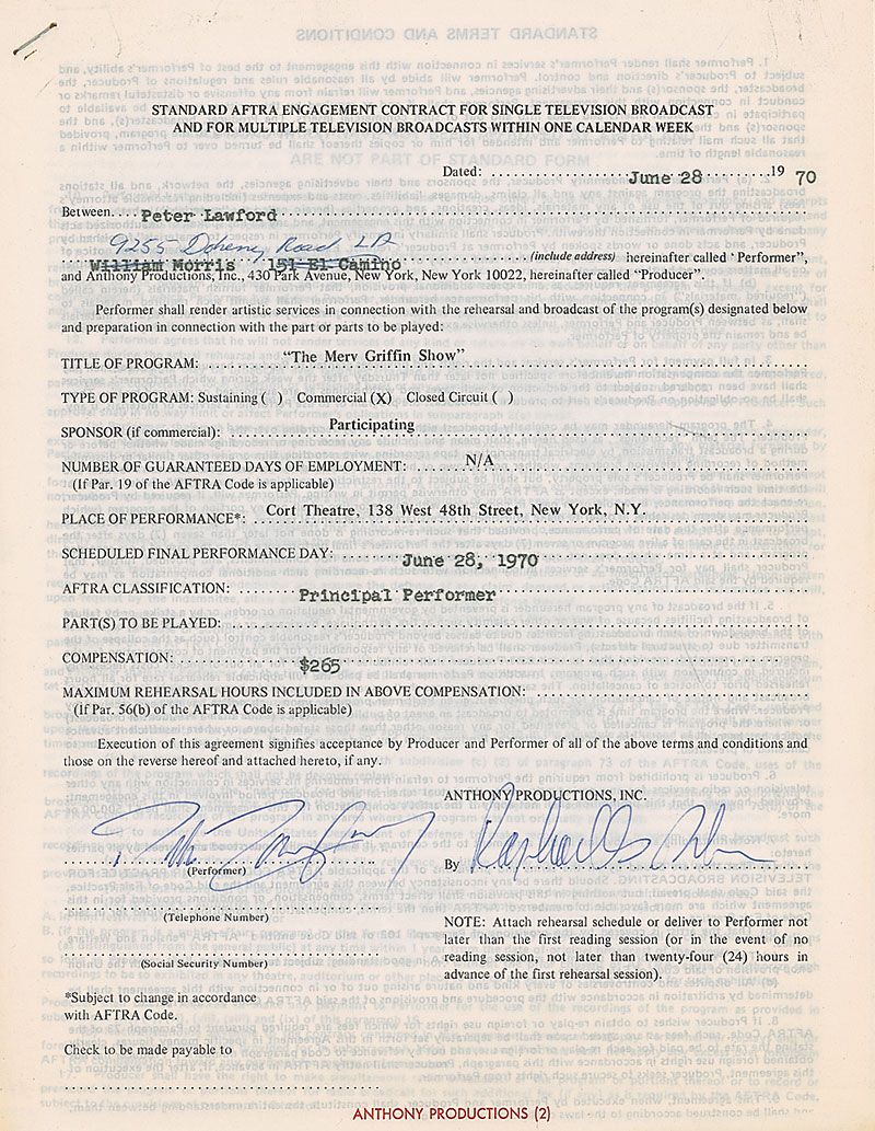DS, one page, 8.5 x 11, June 28, 1970. Standard AFTRA contract in which Lawford agrees to appear on The Merv Griffin Show on the same day in exchange for $265. Signed at the conclusion in ballpoint by Lawford. A standard AFTRA rider is stapled to the main document in the upper left. In fine condition, with expected document wear.