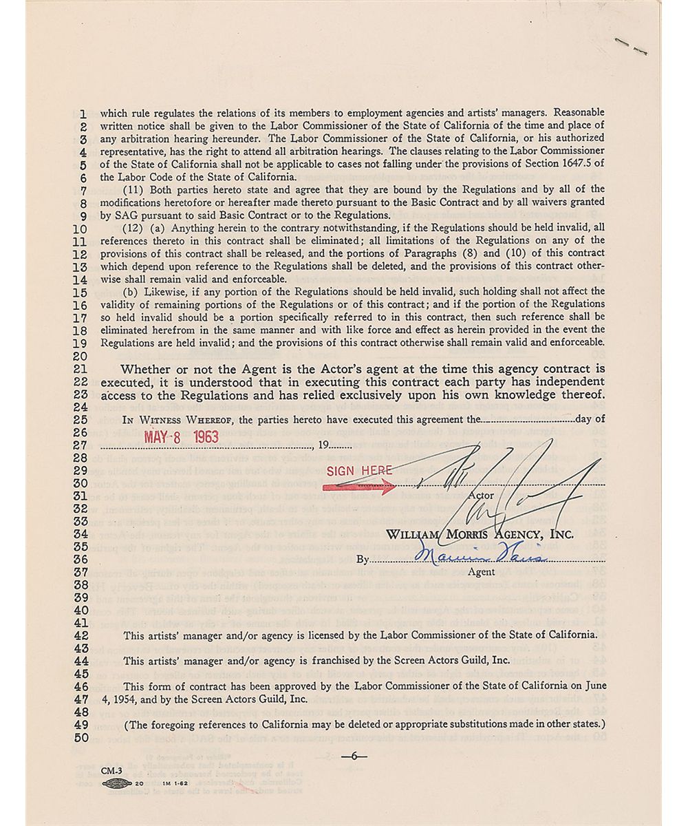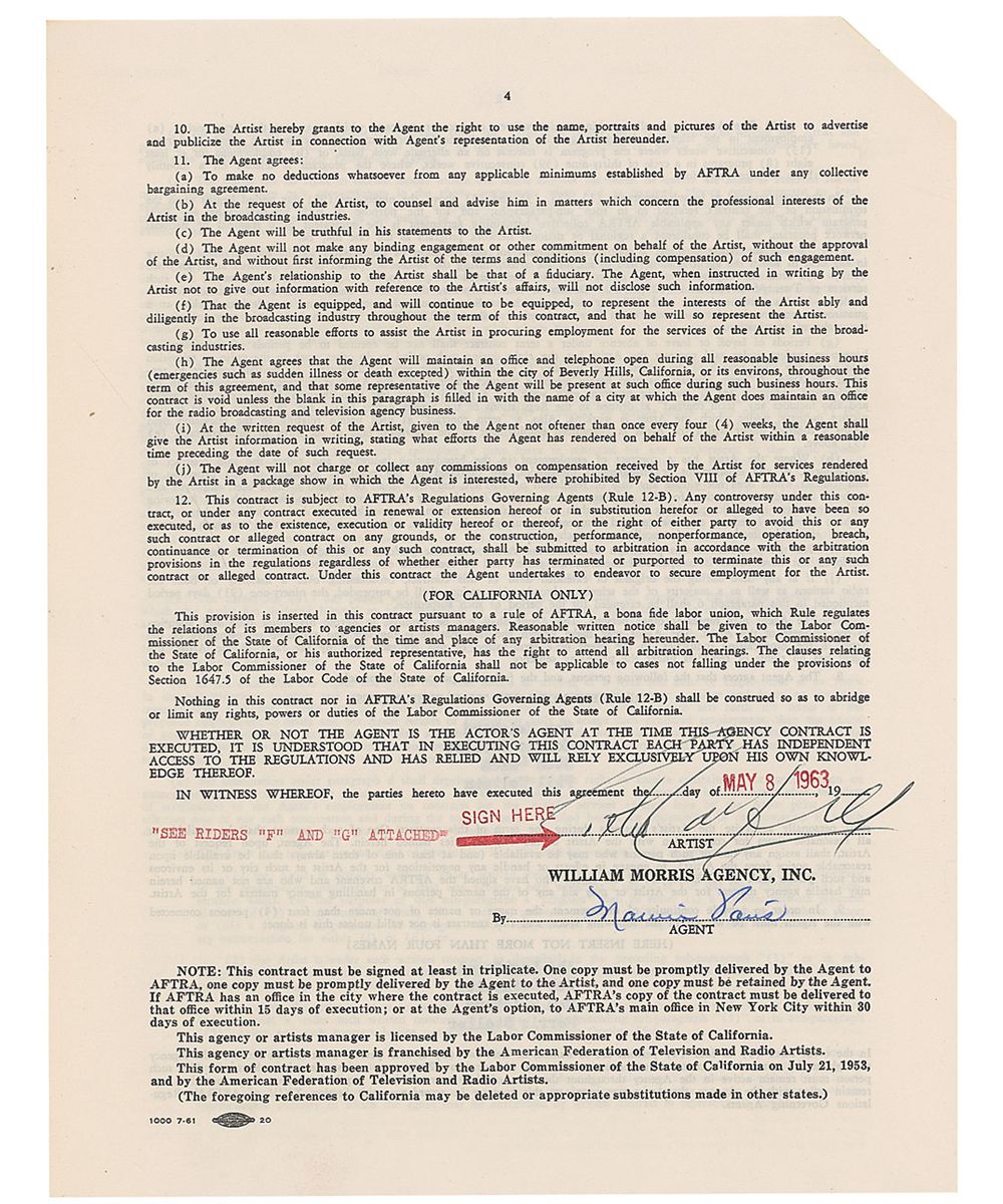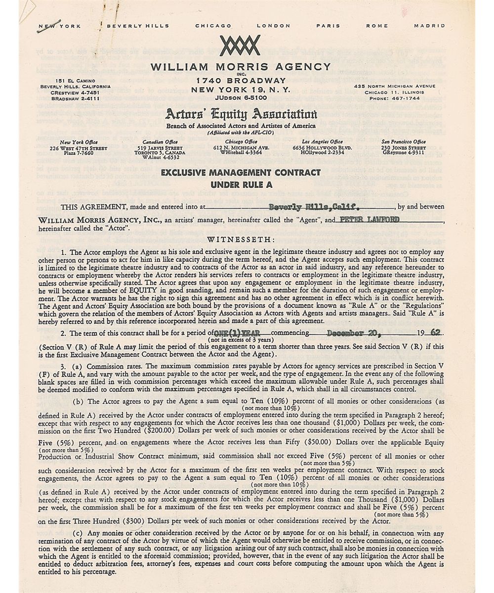 Series of four documents, totaling thirteen sheets, 8.5 x 11, December 20, 1962. William Morris Agency contracts under which Lawford agrees to be represented by the firm for a period of one year at a rate of 10% of earnings, including an Actor’s Equity Association contract, Theatrical Motion Picture Agency contract, Standard AFTRA contract with two initialed riders, and a Television Motion Picture Agency contract with an initialed Screen Actors Guild rider. All four are signed at the conclusion in ballpoint by Lawford and his agent. In overall fine condition, with expected document wear.