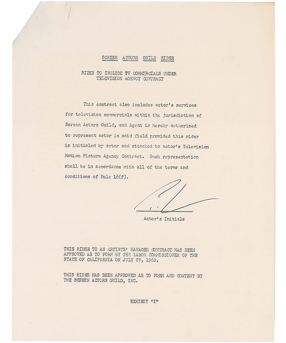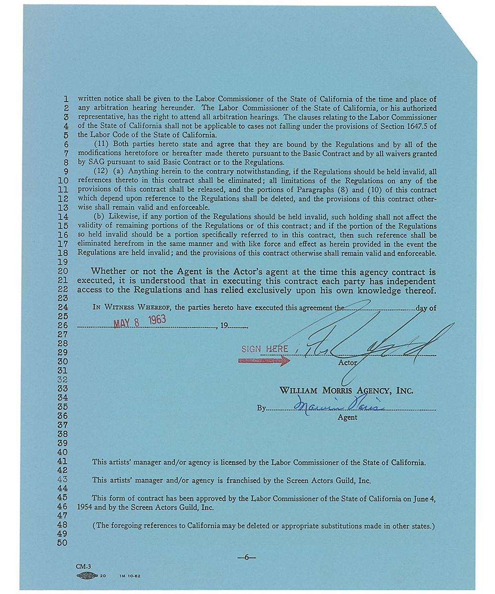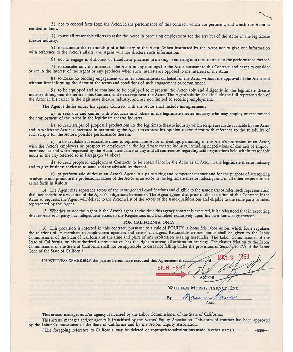 Series of four documents, totaling thirteen sheets, 8.5 x 11, December 20, 1962. William Morris Agency contracts under which Lawford agrees to be represented by the firm for a period of one year at a rate of 10% of earnings, including an Actor’s Equity Association contract, Theatrical Motion Picture Agency contract, Standard AFTRA contract with two initialed riders, and a Television Motion Picture Agency contract with an initialed Screen Actors Guild rider. All four are signed at the conclusion in ballpoint by Lawford and his agent. In overall fine condition, with expected document wear.