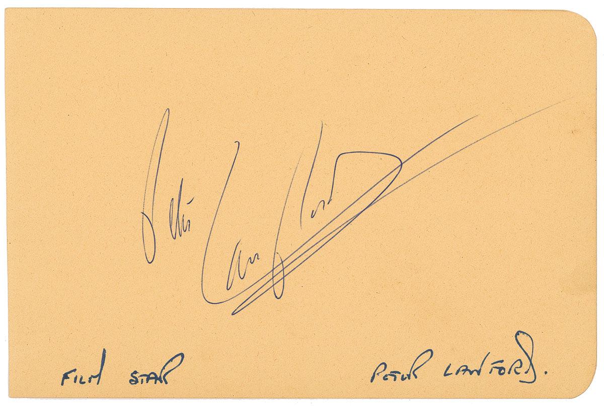 Handsome, longtime contract player for MGM, perhaps best remembered as a member of the Rat Pack, along with Dean Martin, Frank Sinatra, Sammy Davis, Jr., and Joey Bishop. They appeared together in Ocean’s Eleven in 1960. Vintage ballpoint signature, “Peter Lawford,” on a beige 6.5 x 4.25 album page, with collector’s notations along bottom. In fine condition.