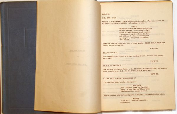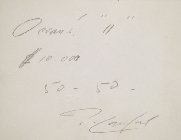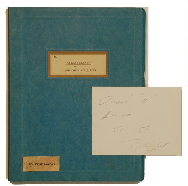 This is the original script used by Peter Lawford for the movie "Oceans 11". It has annotations throughout it, where last minute changes where made to speaking parts in the movie. The script is in fine condition and still has Peter Lawfords name affixed on the bottom right and came originally from his estate. The script is also accompanied with an original signed card from Lawford where he wrote "Oceans 11 , 50-50 $10,000, Peter Lawford" this note is related to the plot of the movie and is probably unique. The script is also accompanied with an original flyer and copy of some related legal paperwork for the movie. Lawford is the one who actually purchased the rights to the movie in 1958. Ocean's 11 is a 1960 heist film directed by Lewis Milestone Centered on a series of Las Vegas casino robberies, starring five Rat Packers: Peter Lawford, Frank Sinatra, Dean Martin, Sammy Davis, Jr. and Joey Bishop. Fantastic lot. A remake, directed by Steven Soderbergh, starring George Clooney, Brad Pitt, Matt Damon, Andy García, Julia Roberts, Bernie Mac, and Don Cheadle (among others) was released in 2001, followed by a pair of sequels.