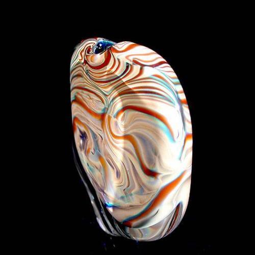 Peter Layton "Chalcedony" small, clear-encased, flattened, stone-form vase, with overlapping cream, beige, aqua, and caramel-colored swirls. Signed. Height 5 5/8".
