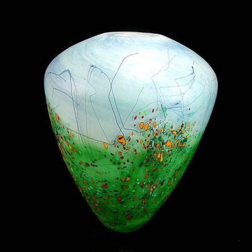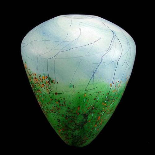 Peter Layton "Landscape" large ovoid vase, with scattered green, brown, aqua, and golden-yellow leaves, on green ground, over frosted pale blue. Signed. Height 7 1/4".