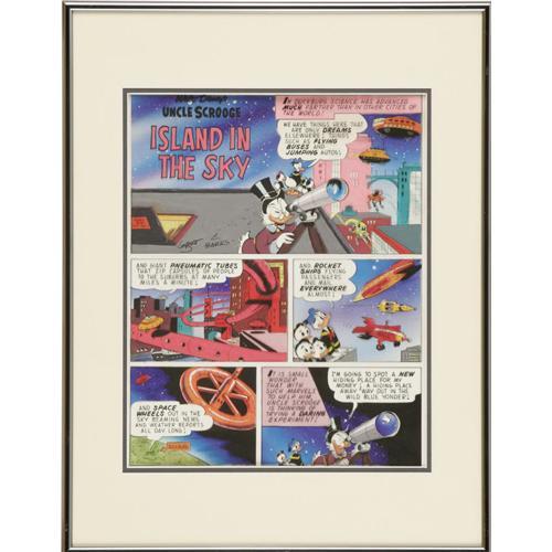 <B>Peter Ledger and Carl Barks - Uncle Scrooge: His Life and Times, page 290 Original Art (Celestial Arts, 1981).</B></I> Here is the title page for the Carl Barks story, "Island in the Sky," airbrushed in glorious color by Peter Ledger. Used in the book, <B>Uncle Scrooge: His Life and Times</B></I>, a page from Barks' original art was photocopied onto a sheet of acetate, which sits over Ledger's full color work. The art has an image area of 9.5" x 12", is matted and framed, and in Excellent condition. Signed by Peter Ledger and Carl Barks in the first panel. Includes a certificate of authenticity. <BR><BR><B>Important notice:</B> Heritage usually auctions material at the rate of 200-250 lots per hour. On some occasions eBay Live bid software or the Internet may not be able to keep up with the pace of the auction. We recommend placing a realistic absentee bid now as insurance to avoid disappointment. Occasionally the auctioneer may eliminate or reject an eBay Live bid, and the auctioneer may also reopen a lot after the close of the eBay live bidding (usually because we missed an audience bid), and may reject your bid even if it shows you as the winning bidder. By bidding via eBay Live, you agree that Heritage may award the lot to another bidder at its sole discretion under the circumstances described above or any other reasonable circumstances. Since eBay bids are not shown to us until we open the lot on the floor, we treat those bids just like floor bids. In most cases the floor responds before the eBay bid is presented to us, due to Internet lag time, so for consistency we have made it a policy that floor bids are always considered first over tie eBay live bids. Also please note that all Heritage lots purchased through eBay Live carry a 22.5% Buyer's Premium. Please make sure you read the Terms and Conditions before you bid. This lot is being auctioned in conjunction with a live floor auction by Heritage Auction Galleries. All final auction and invoice information will be supplied by Heritage Auction Galleries, and all other information should be considered preliminary. Lot:41001 <BR><BR><B>Winning Notification and Billing:</B> After the FINAL session in this auction is complete, Heritage will send e-mail and snail mail invoices. This process normally takes several days. All final auction and invoice information will be supplied by Heritage Auction Galleries, and all other information should be considered preliminary. <BR><BR>This auction will be conducted on a live auction floor and over the Internet through eBay Live. If you choose to place an absentee bid, please take a moment to <font color='#0000ff'><u><a href='http://pages.ebay.com/liveauctions/help/before/laabsentee.html'>learn how eBay Live absentee bidding works</a></u></font><font color='#000000'>