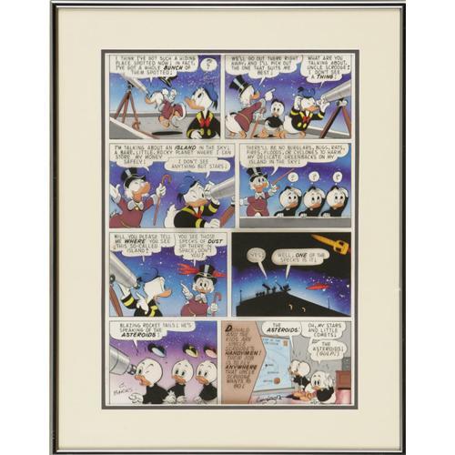 <B>Peter Ledger and Carl Barks - Uncle Scrooge: His Life and Times, page 297 Original Art (Celestial Arts, 1981).</B></I> From the Carl Barks story, "Island in the Sky," comes this stunning airbrushed page of color art by Peter Ledger. Printed in the book, <B>Uncle Scrooge: His Life and Times</B></I>, this page from Barks' original art was photocopied onto a sheet of acetate, which sits over Ledger's full color work. The art has an image area of 9.5" x 13.75". Matted and framed, the condition is Excellent. Signed by Peter Ledger and Carl Barks in the final two panels. Includes a certificate of authenticity. <BR><BR><B>Important notice:</B> Heritage usually auctions material at the rate of 200-250 lots per hour. On some occasions eBay Live bid software or the Internet may not be able to keep up with the pace of the auction. We recommend placing a realistic absentee bid now as insurance to avoid disappointment. Occasionally the auctioneer may eliminate or reject an eBay Live bid, and the auctioneer may also reopen a lot after the close of the eBay live bidding (usually because we missed an audience bid), and may reject your bid even if it shows you as the winning bidder. By bidding via eBay Live, you agree that Heritage may award the lot to another bidder at its sole discretion under the circumstances described above or any other reasonable circumstances. Since eBay bids are not shown to us until we open the lot on the floor, we treat those bids just like floor bids. In most cases the floor responds before the eBay bid is presented to us, due to Internet lag time, so for consistency we have made it a policy that floor bids are always considered first over tie eBay live bids. Also please note that all Heritage lots purchased through eBay Live carry a 22.5% Buyer's Premium. Please make sure you read the Terms and Conditions before you bid. This lot is being auctioned in conjunction with a live floor auction by Heritage Auction Galleries. All final auction and invoice information will be supplied by Heritage Auction Galleries, and all other information should be considered preliminary. Lot:41001 <BR><BR><B>Winning Notification and Billing:</B> After the FINAL session in this auction is complete, Heritage will send e-mail and snail mail invoices. This process normally takes several days. All final auction and invoice information will be supplied by Heritage Auction Galleries, and all other information should be considered preliminary. <BR><BR>This auction will be conducted on a live auction floor and over the Internet through eBay Live. If you choose to place an absentee bid, please take a moment to <font color='#0000ff'><u><a href='http://pages.ebay.com/liveauctions/help/before/laabsentee.html'>learn how eBay Live absentee bidding works</a></u></font><font color='#000000'>