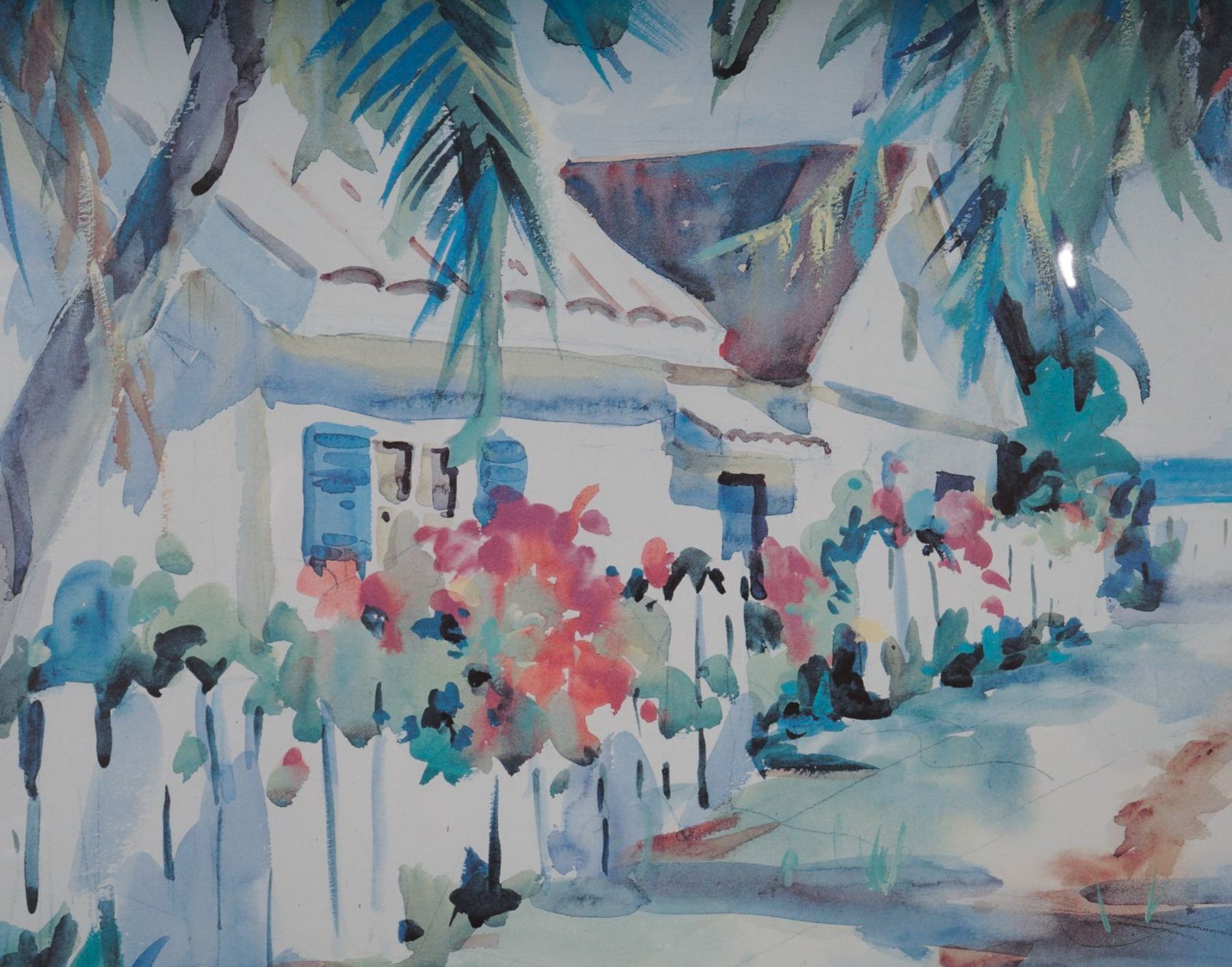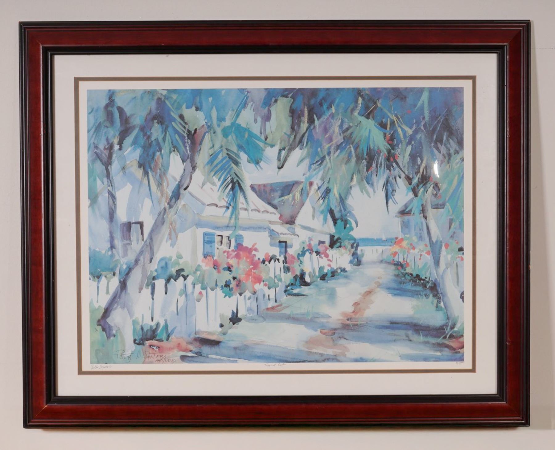 Vibrant limited edition lithograph on paper by American artist Peter L. Spataro. This impression captures a lush tropical street lined with palm trees, white picket fences, and flowering shrubs leading toward seaside cottages. Signed in pencil lower left and within the plate lower right. Professionally double-matted and presented in a mahogany-toned frame under glass. Numbered 61/1500.