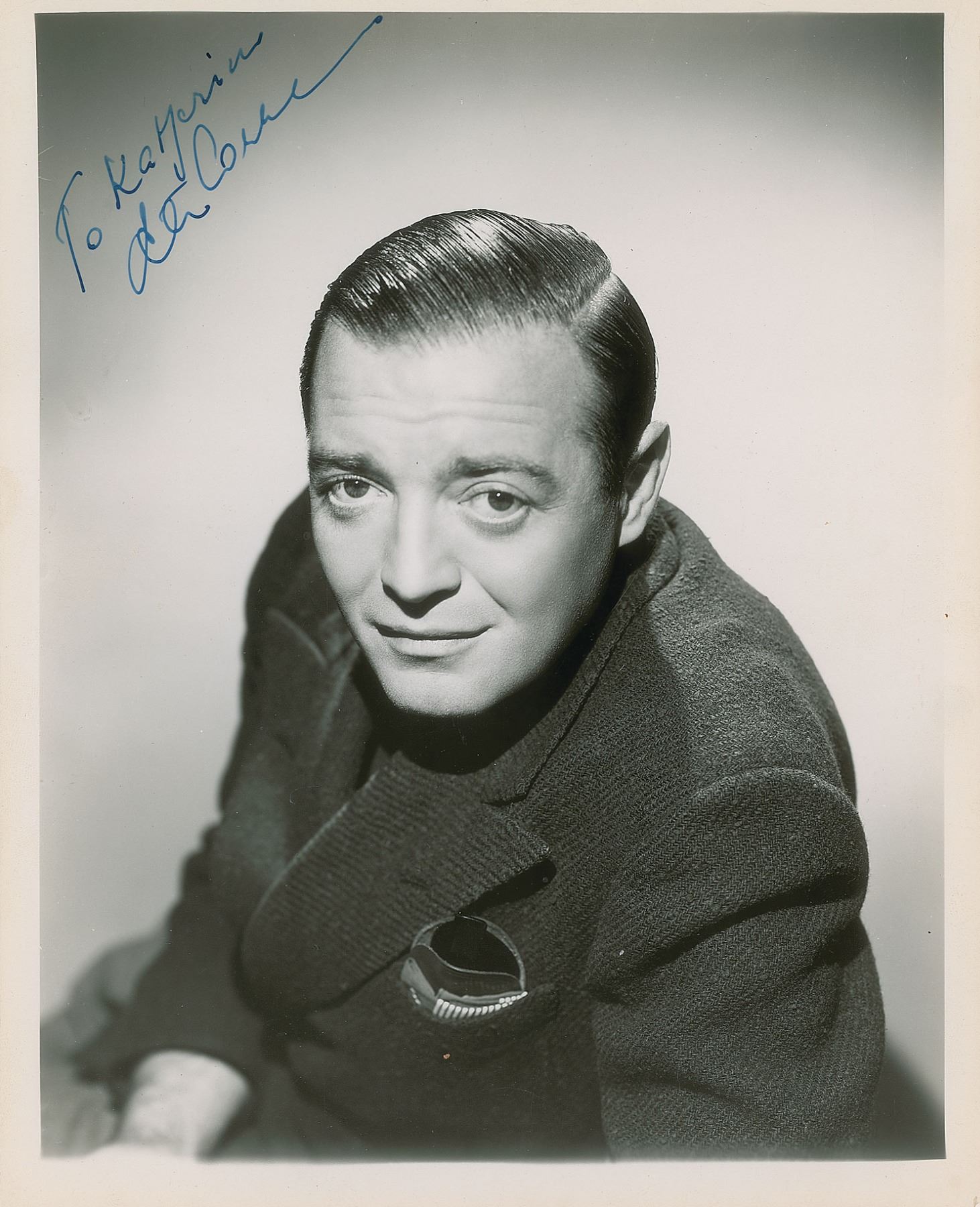 Vintage glossy 8 x 10 photo of Lorre in a handsome pose, signed and inscribed in fountain pen, "To Katjerine, Peter Lorre.” In fine condition, with some small surface creases.
