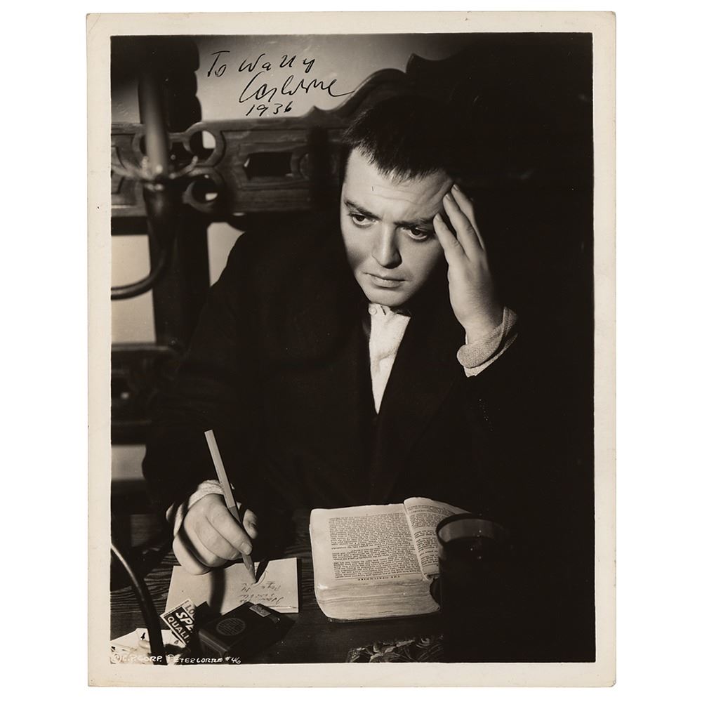Vintage glossy 8 x 10 photo of Lorre as Raskolnikov in Josef von Sternberg's 1935 film adaptation of Dostoevsky's Crime and Punishment, signed and inscribed in fountain pen, "To Wally, Peter Lorre, 1936.” In fine condition.