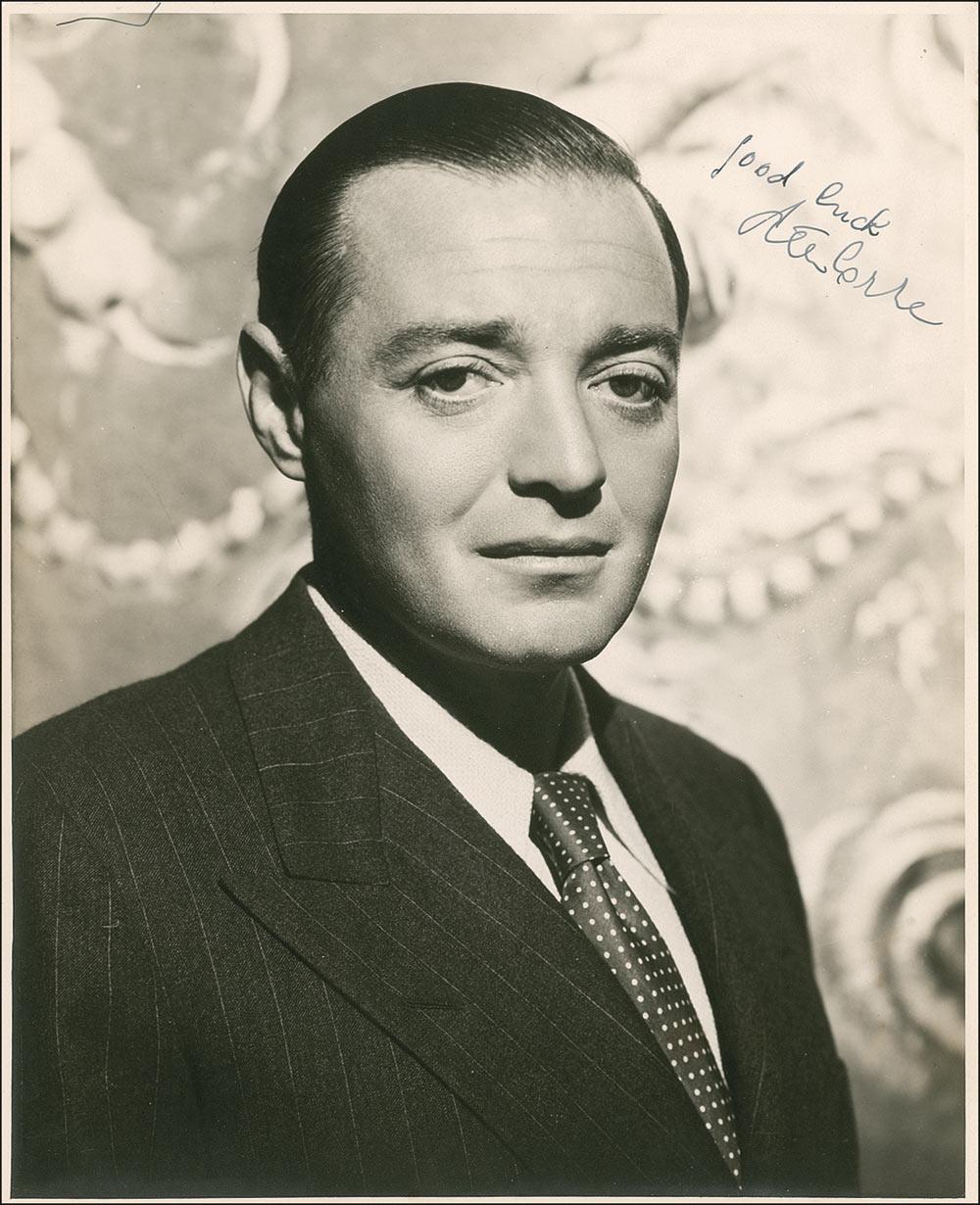 Hungarian-born actor (1904–1964) best known for his memorable roles in such classics as M, the Mr. Moto films, and Casablanca. Vintage matte-finish 7.75 x 9.5 photo of Lorre in a pin-stripe suit, signed in fountain pen, “Good luck, Peter Lorre.” In fine condition, with a stray ink mark to top left and some light silvering along bottom edge.