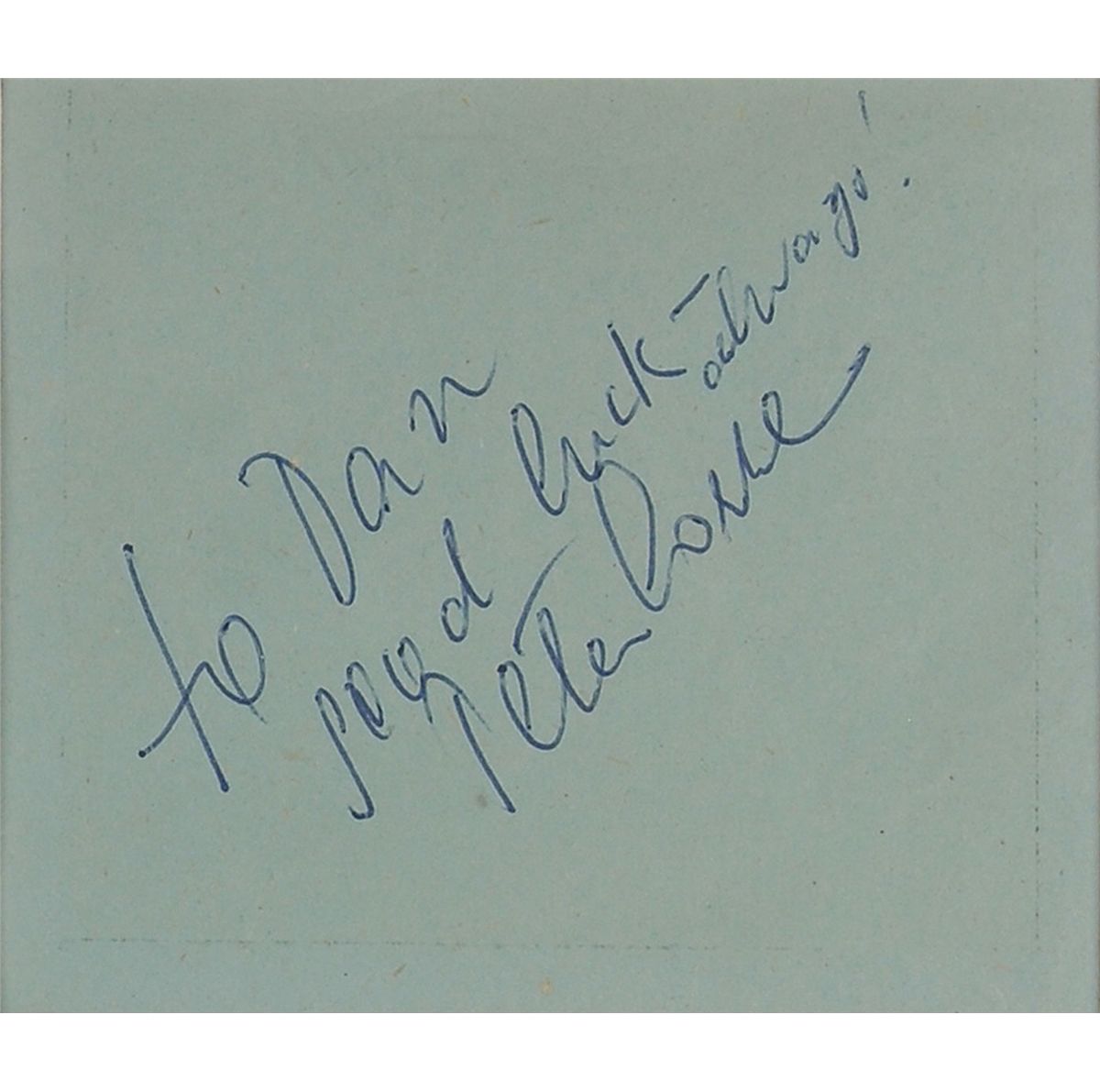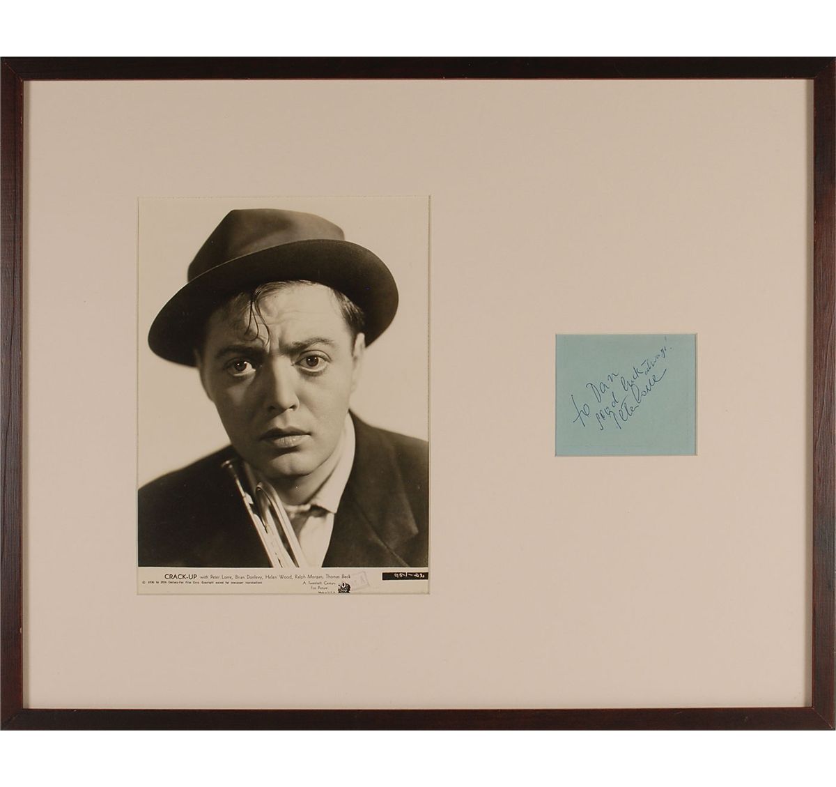 Vintage ballpoint signature and inscription, “To Dan, good luck—always! Peter Lorre,” on a blue 3.5 x 3 album page. Matted and framed with an unsigned original publicity photo of Lorre to an overall size of 21 x 17. In fine condition, with some trivial fo