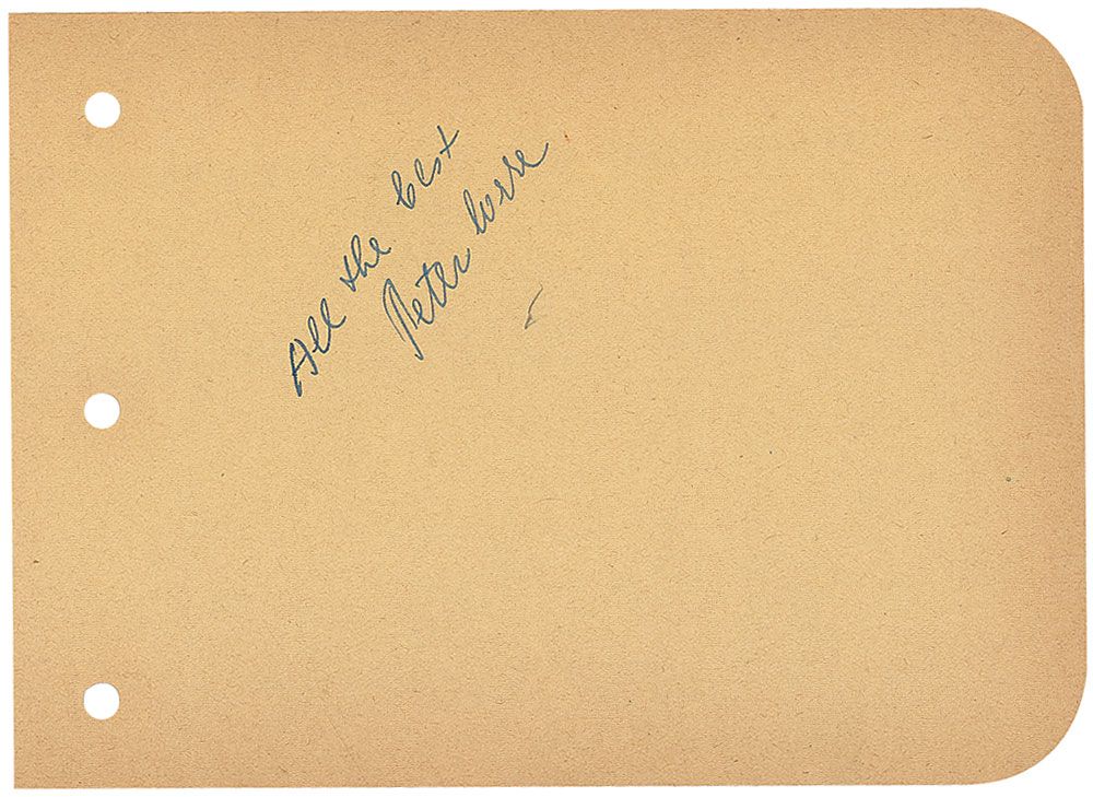 Vintage fountain pen signature, “All the best, Peter Lorre,” on an off-white 6 x 4.5 album page. In fine condition.