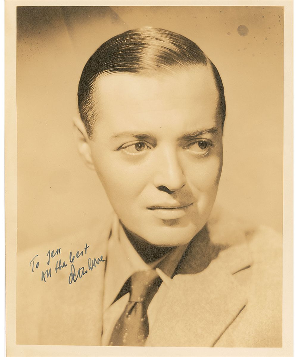 Outstanding vintage sepia matte-finish 8 x 10 portrait of the ever-intense Lorre in a light jacket and patterned tie, looking to his left, signed and inscribed in fountain pen “To Jen, All the best, Peter Lorre.” In fine condition, with a few scattered spots of discoloration in the upper corners from flaws inherent in the negative.
