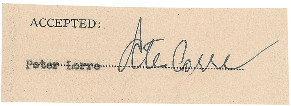 Choice vintage ink signature, “Peter Lorre,” on an off-white 3.5 x 1.25 slip clipped from a document. In very fine condition.