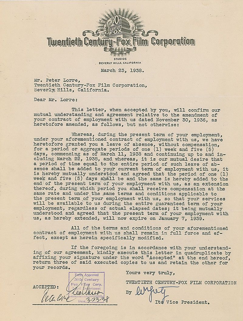 DS, one page, 8.5 x 11, March 23, 1938. Agreement between Lorre and 20th Century Fox, granting him a 12 day unpaid leave of absence and extending his contractual obligation by the same amount. Crisply signed at the conclusion in fountain pen by Lorre and two Fox representatives. In fine condition, with expected document wear.