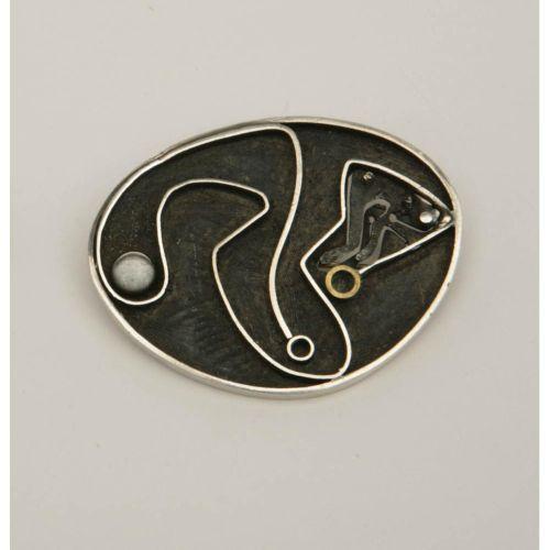 Artist Name: Peter Macchiarini<BR>Manufacturer: <BR>Description: Brooch<BR>Circa: Executed circa 1960<BR>Medium: Sterling, copper and ebony<BR>Signature: <BR>Measurements: <BR>Edition: <BR>Notes: <BR>Literature / Provenance: