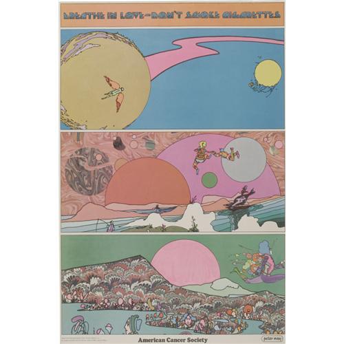<B>Peter Max - American Cancer Society Poster.</B></I> From the free love era comes this heartfelt message -- "Breathe in love -- not cigarette smoke!" This Peter Max poster has an approximate overall size of 16" x 24.5", and is in Very Good condition.<BR><BR><b>Shipping:</b> Flat Material, Large (<a target="_blank" href="http://www.heritageauctions.com/common/shipping.php">view shipping information</a>)