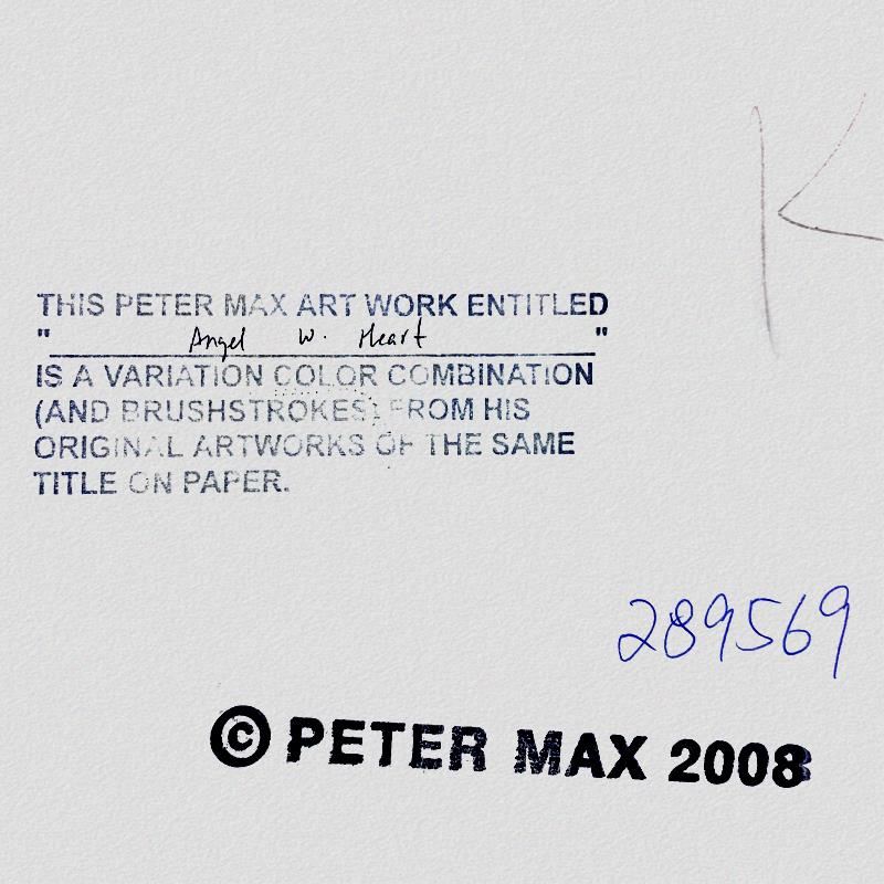 "Angel with Heart" is a one-of-a-kind mixed media on paper, hand signed by Peter Max. The piece comes custom framed with a backside cutout to display Peter Max Studio registration number 289569 certifying authenticity. Measures approximately 48" x 36" (frame), 36" x 24" (image).