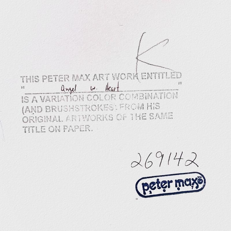 "Angel with Heart" is a hand signed one-of-a-kind acrylic mixed media on paper by Peter Max. The piece comes custom framed with a backside cutout to display Peter Max Studio registration number 269142 certifying authenticity. Measures approximately 30" x 26" (frame), 17" x 13" (image).