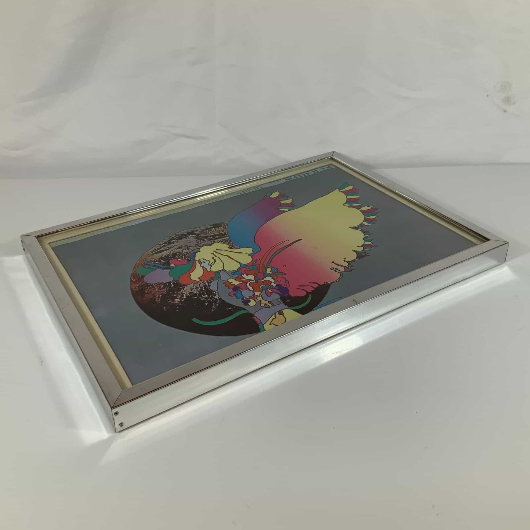 This offset lithograph poster by Peter Max, titled Apollo 11 Number Two, commemorates the 1969 moon landing in the artist's signature psychedelic pop art style. The central composition depicts a multi-colored winged figure set against a terrestrial globe representing Earth. The upper margin features printed text reading From the Moon on the left and Apollo 11 1969 on the right. Centered between these is a quote attributed to Meher Baba: We are the Earth in its true light, as a whole and realize that we are all one. The artist's name is plate-signed within a small blue rectangular box at the lower center. The print is housed in a contemporary slim-profile chrome-finished metal frame behind glass. The reverse of the backing board is stamped with the number #4235 and shows legacy adhesive residue. No edition number is visible on the print.