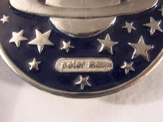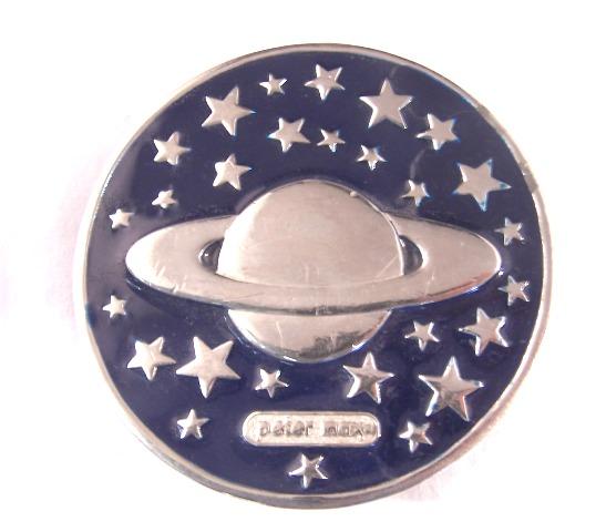 Peter Max Belt Buckle featuring Saturn planet surrounded by stars. Approx 3" round. Condition, normal use and wear. Ca 1970