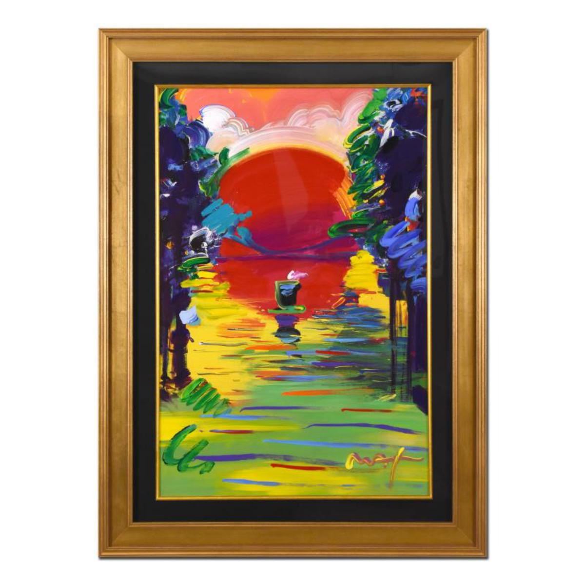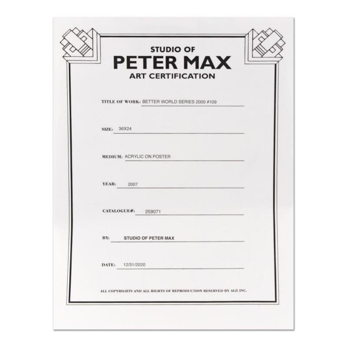 "Better World" is a one-of-a-kind acrylic mixed media on paper, hand signed by Peter Max. This piece comes custom framed. Includes Certificate of Authenticity from Peter Max Studios. Measures approx. 33.5" x 45.5" (with frame), 23" x 35" (image). Reference #: 247541