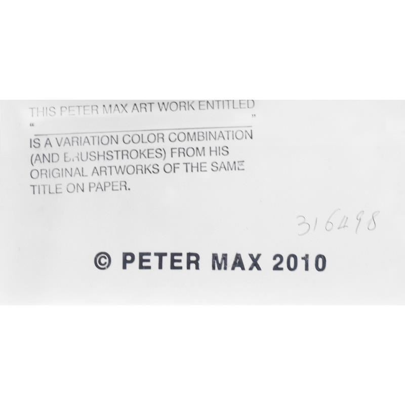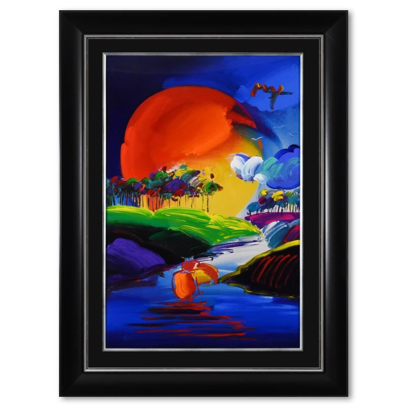 "Beyond Borders" is a one-of-a-kind acrylic mixed media on paper, hand signed by Peter Max. This piece comes custom framed. Includes Letter of Authenticity from Peter Max Studios and bears registration number inverso (316498). Measures approx. 34.5" x 46.5" (with frame), 23" x 35" (image).