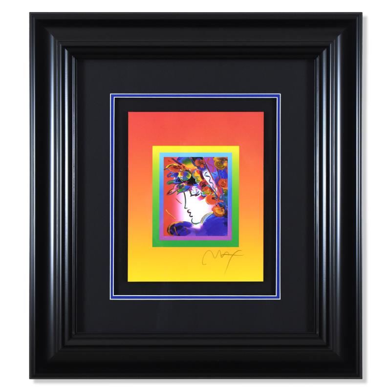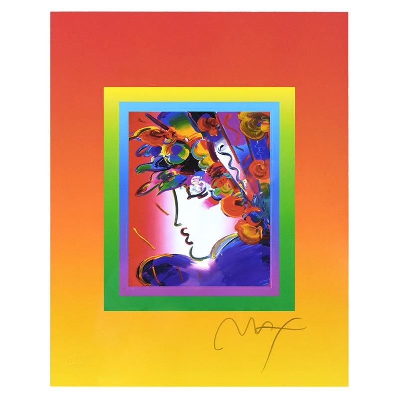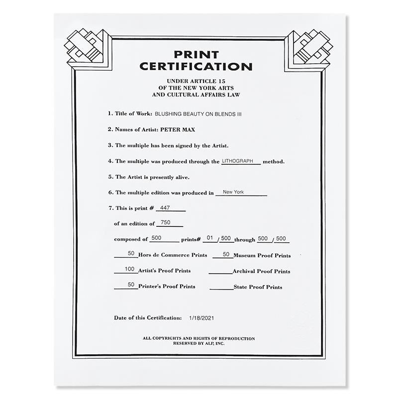 "Blushing Beauty on Blends" is a limited edition lithograph on paper by Peter Max, numbered 447/500 and hand signed by the artist. This piece comes framed and includes Certificate of Authenticity from Peter Max Studios. Measures approximately 27.5" x 25 (frame), 13" x 10" (image).