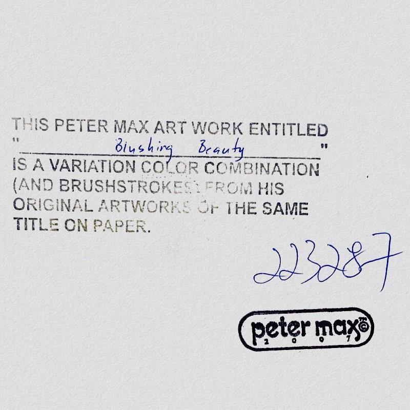 "Blushing Beauty" is a one-of-a-kind mixed media on paper, hand signed by Peter Max. The piece comes custom framed with a backside cutout to display Peter Max Studio registration number 223287 certifying authenticity. Measures approximately 48" x 36" (frame), 36" x 24" (image).