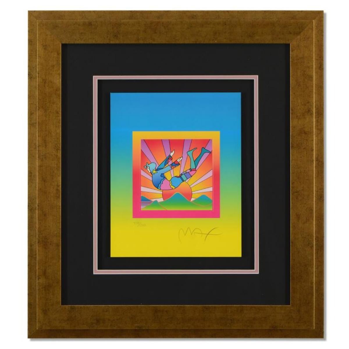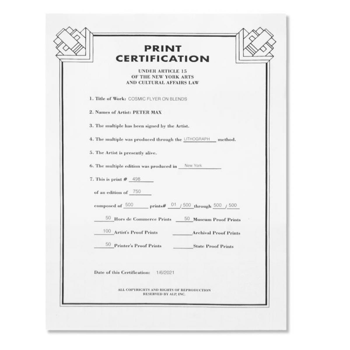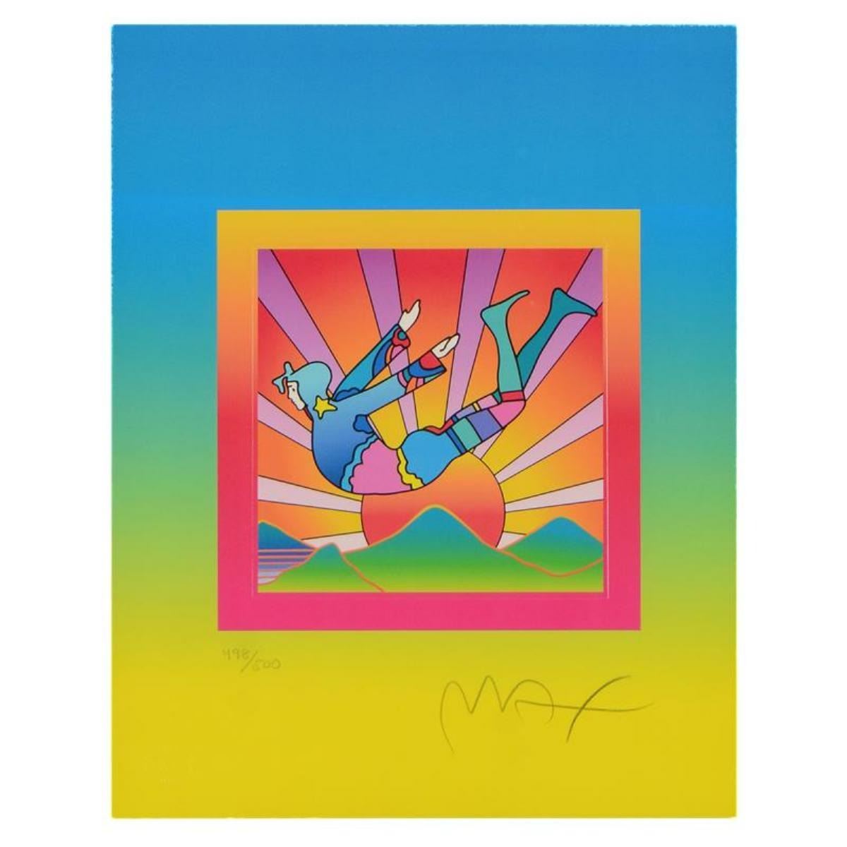 Peter Max, "Cosmic Flyer on Blends" Framed Limited Edition Lithograph, Numbered 498/500 and Hand Signed with Certificate of Authenticity. "Cosmic Flyer on Blends" is a limited edition lithograph on paper by Peter Max, numbered 498/500 and hand signed by the artist. This piece comes framed. Includes Certificate of Authenticity from Peter Max Studios. Measures approximately 23.5" x 25.5" (frame), 10" x 13" (image).