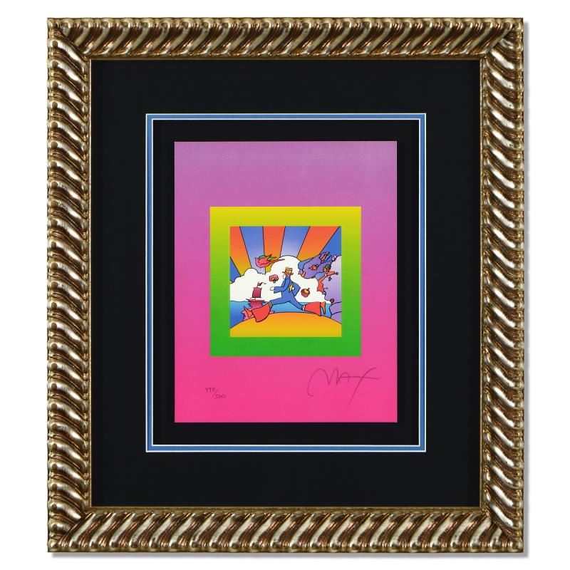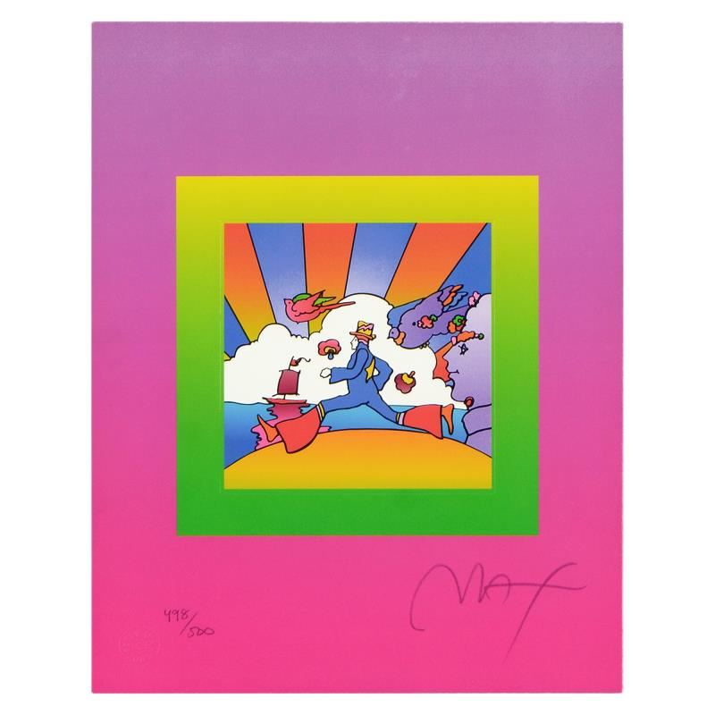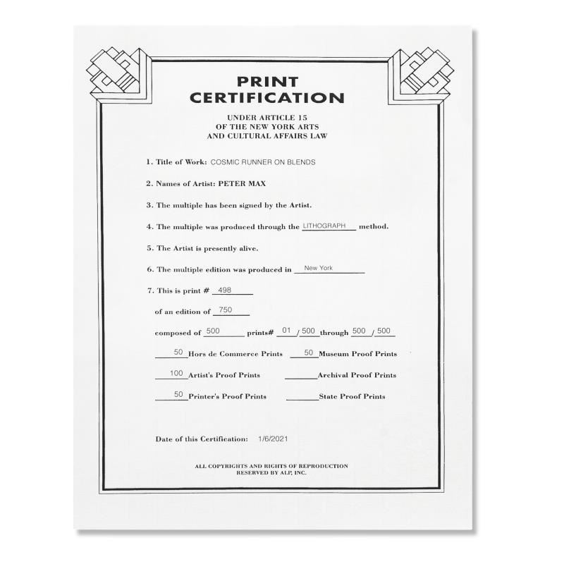 "Cosmic Runner on Blends" is a limited edition lithograph on paper by Peter Max, numbered 498/500 and hand signed by the artist. This piece comes framed. Includes Certificate of Authenticity from Peter Max Studios. Measures approximately 21" x 24" (frame), 10" x 13" (image).