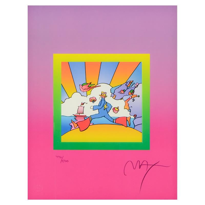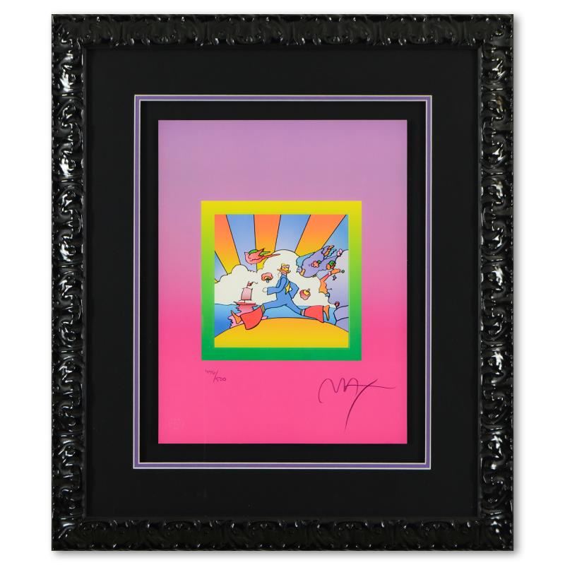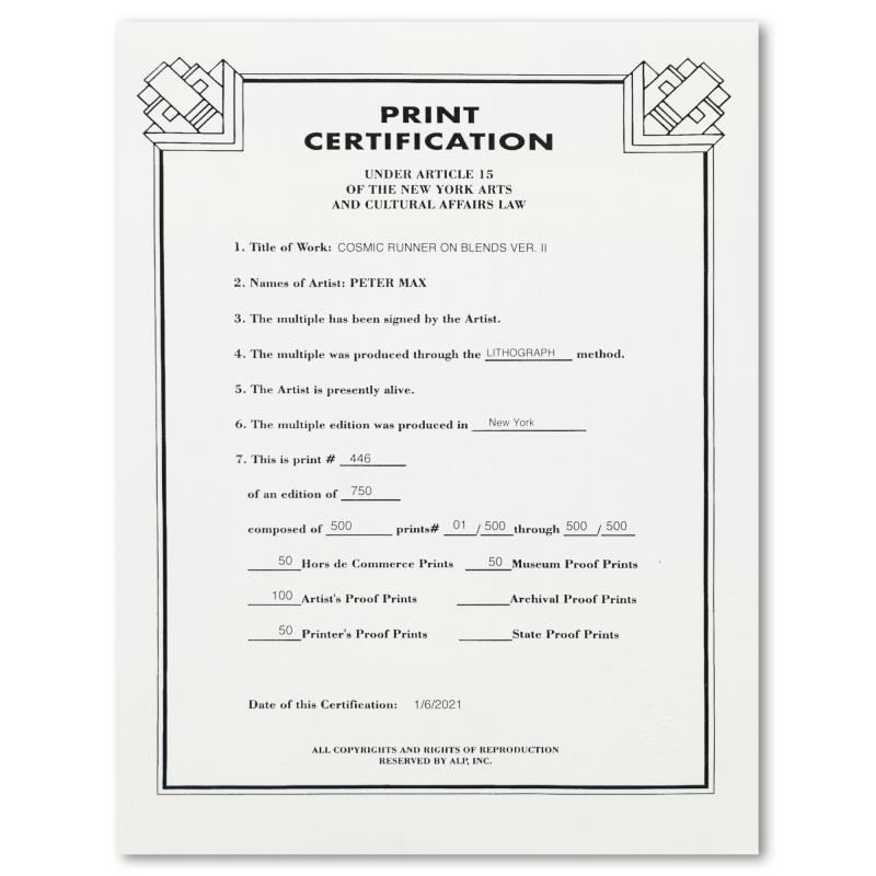"Cosmic Runner on Blends Ver II" is a limited edition lithograph on paper by Peter Max, numbered 446/500 and hand signed by the artist. This piece comes framed. Includes Certificate of Authenticity from Peter Max Studios. Measures approximately 24.5" x 28.5" (frame), 13" x 17" (image).