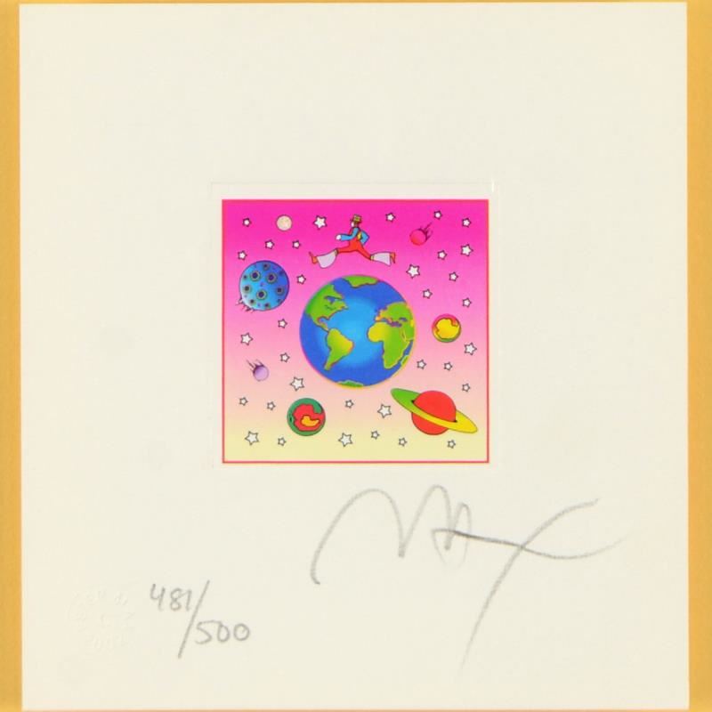 "Cosmic Runner with Planets" is a limited edition lithograph on paper by Peter Max, numbered 481/500 and hand signed by the artist. This piece comes framed and includes Certificate of Authenticity. Measures approximately 12" x 12" (frame), 5" x 4.5" (image).