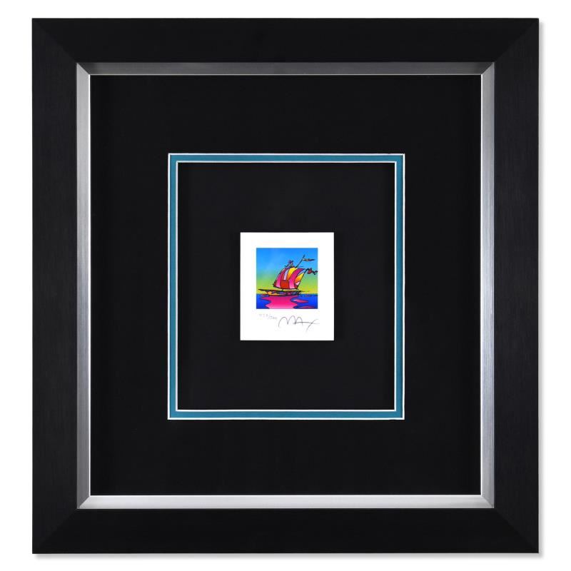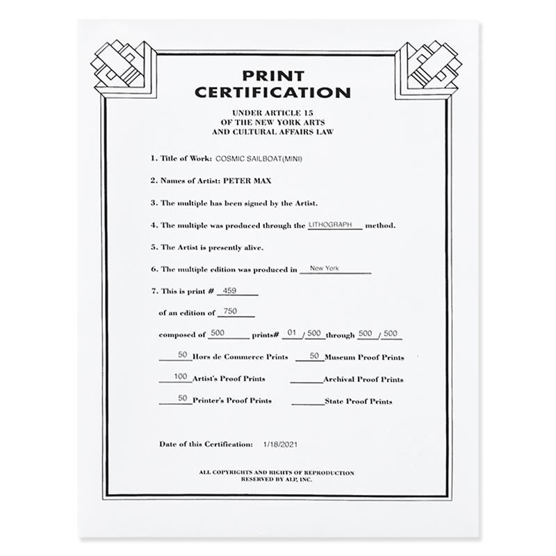 "Cosmic Sailboat" is a limited edition lithograph on paper by Peter Max, numbered 459/500 and hand signed by the artist. This piece comes framed and includes Certificate of Authenticity from Peter Max Studios. Measures approximately 17.5" x 16.5 (frame), 3" x 3" (image).