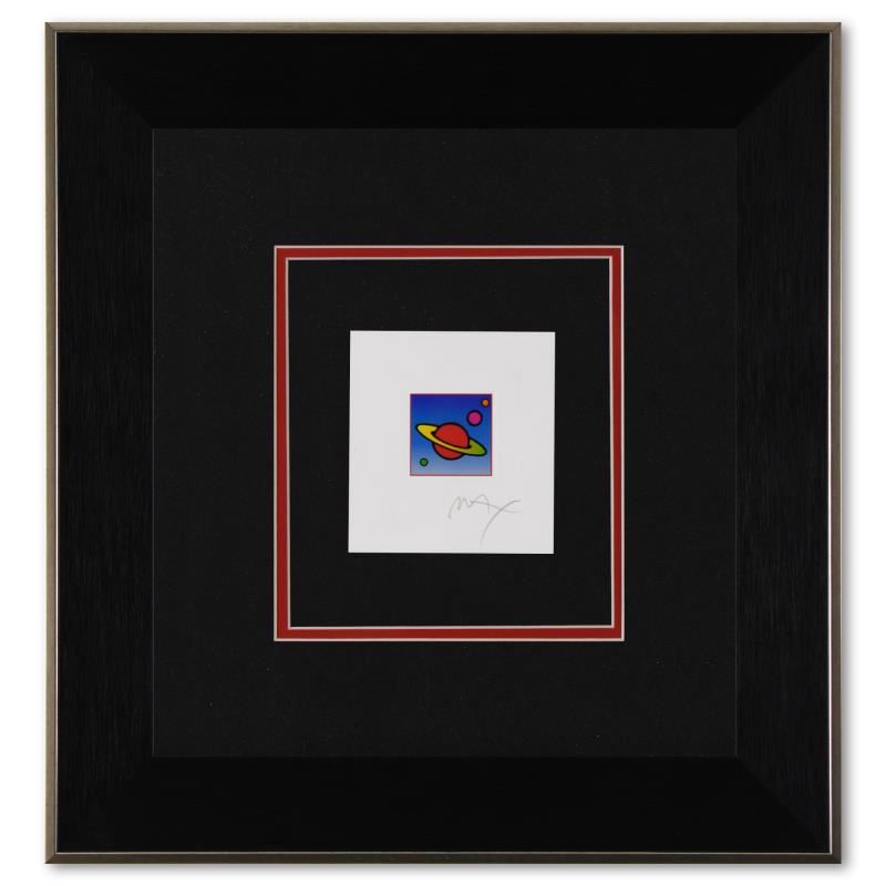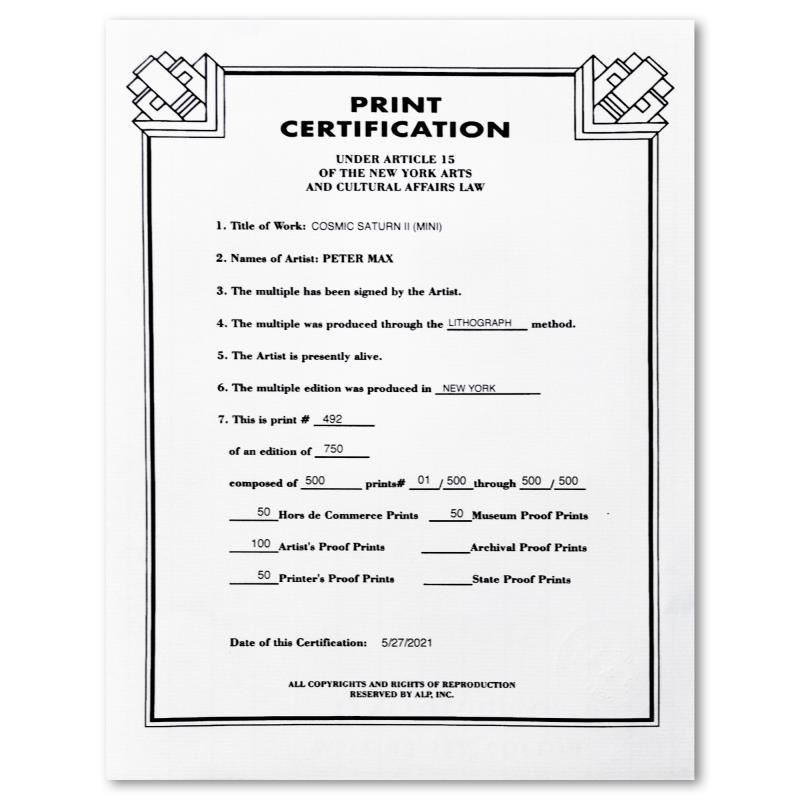 "Cosmic Saturn II" is a limited edition lithograph on paper by Peter Max, numbered 492/500 and hand signed by the artist. This piece comes framed. Includes Certificate of Authenticity from Peter Max Studios. Measures approximately 17.5" x 18.5" (frame), 5" x 4" (image).