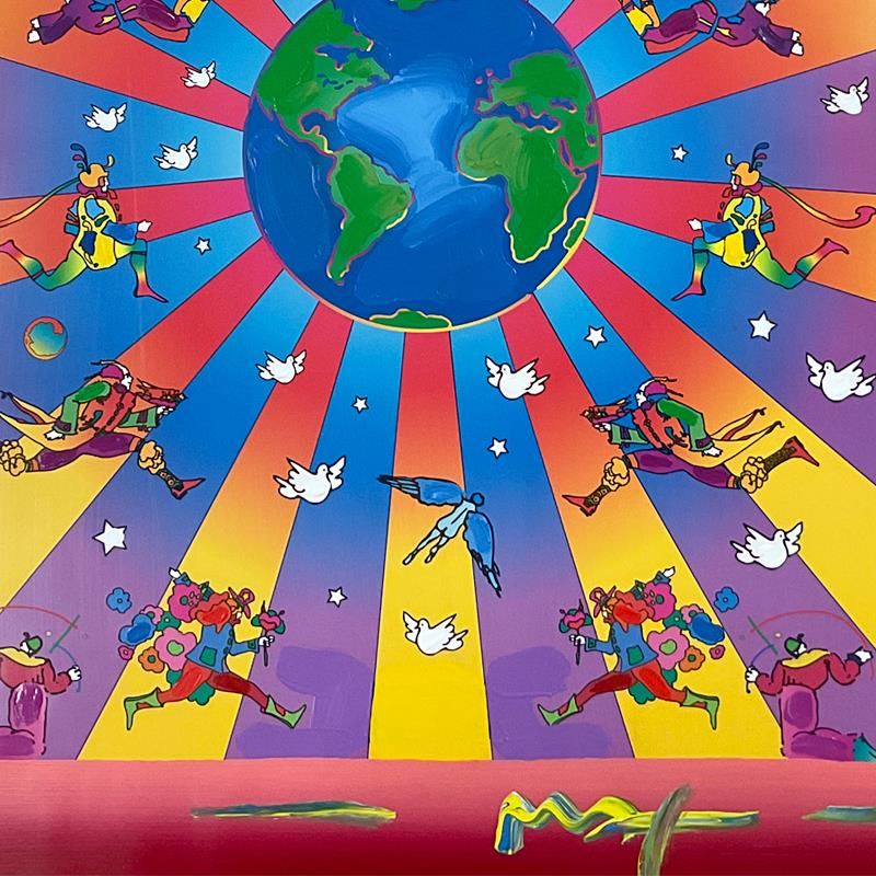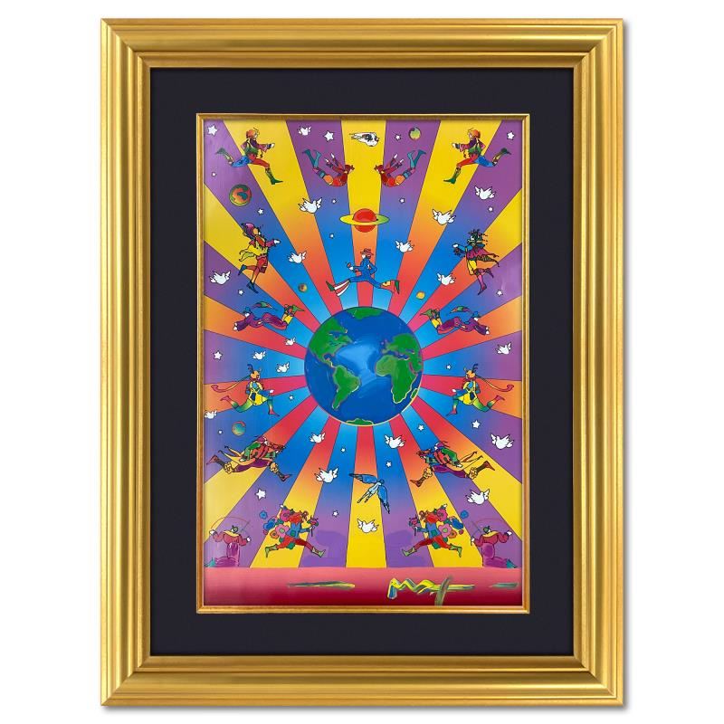 "Earth Day 2000" is a one-of-a-kind acrylic mixed media on paper, hand signed by Peter Max. On the reverse side of this piece there is a registration number from Peter Max Studios certifying authenticity. This piece comes custom framed. Measures approx. 48.5" x 36.5" (frame), 36" x 24" (image).
