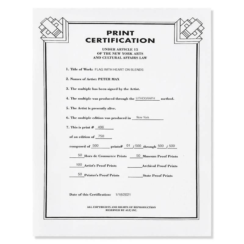 "Flag with Heart on Blends" is a limited edition lithograph on paper by Peter Max, numbered 496/500 and hand signed by the artist. This piece comes framed and includes Certificate of Authenticity from Peter Max Studios. Measures approximately 23.5" x 26 (frame), 10" x 12.5" (image).