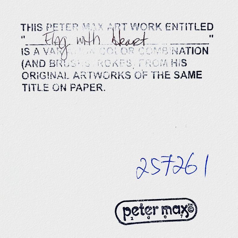 "Flag with Heart" is a hand signed one-of-a-kind acrylic mixed media on paper by Peter Max. The piece comes custom framed with a backside cutout to display Peter Max Studio registration number 257261 certifying authenticity. Measures approximately 30" x 26" (frame), 17" x 13" (image).