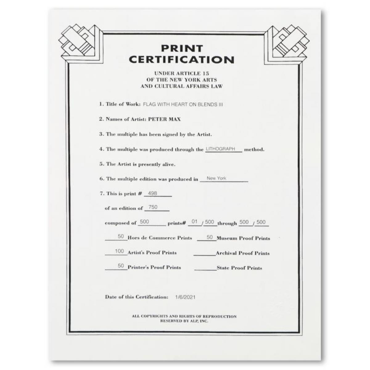 Peter Max, "Flag with Heart on Blends III" Framed Limited Edition Lithograph, Numbered 498/500 and Hand Signed with Certificate of Authenticity. "Flag with Heart on Blends III" is a limited edition lithograph on paper by Peter Max, numbered 498/500 and hand signed by the artist. This piece comes framed. Includes Certificate of Authenticity from Peter Max Studios. Measures approximately 25.5" x 29.5" (frame), 13" x 17" (image).