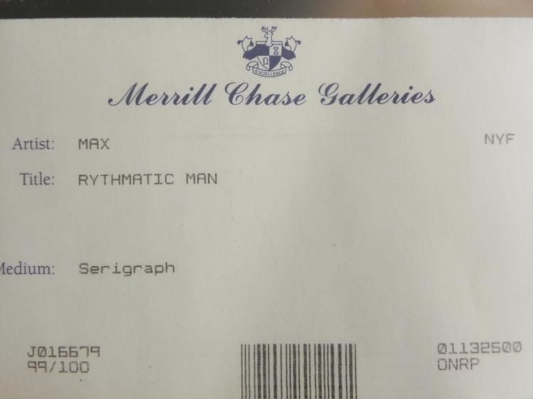 Artist: Peter MaxTitle: Rhythmatic ManMediun: Serigraph print on paperSignature: Signed by artist, lower rightEdition: 99/100, on backDate: 1972Presentation: Black wooden frameImage size: 21" x 28"Condition: Very good; some chips to the wooden frameAuthenticity: Included on back of frameBiography:Peter Max (1937-__) was born in Berlin, grew up in China, and traveled with his family to Israel and throughout Europe before eventually arriving in America. He began painting, and soon rose to prominence in the mid 1960's with expressionistic art that explored wild color juxtapositions. His work in the 1970's included a commission for a postage stamp in the theme of environmental preservation, a cause in which he devoted himself. Max has painted four former U.S. Presidents: Carter, Ford, Bush and Reagan. His concern for world peace has led to his involvement in some significant political events, including stamp designs for the first United Nations Environmental Summit, and a carving from a portion of the Berlin Wall. He has been the official artist for the World Cup USA, the Super Bowl, and the Grammy Awards. His awards are numerous, and include honorable recognition for product, fashion, food, book, and poster designs. His latest project is a collaboration with computer effects producer Silicon Graphics. Peter Max has continued his optimistic world vision into the new Millennium, and strives to be a "Global Artist."