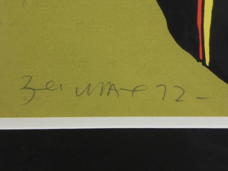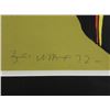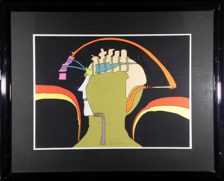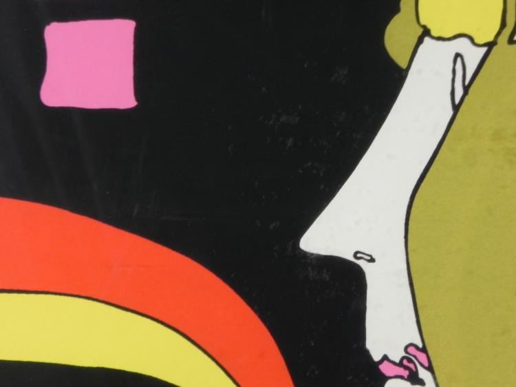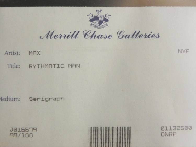 Artist: Peter MaxTitle: Rhythmatic ManMediun: Serigraph print on paperSignature: Signed by artist, lower rightEdition: 99/100, on backDate: 1972Presentation: Black wooden frameImage size: 21" x 28"Condition: Very good; some chips to the wooden frameAuthenticity: Included on back of frameBiography:Peter Max (1937-__) was born in Berlin, grew up in China, and traveled with his family to Israel and throughout Europe before eventually arriving in America. He began painting, and soon rose to prominence in the mid 1960's with expressionistic art that explored wild color juxtapositions. His work in the 1970's included a commission for a postage stamp in the theme of environmental preservation, a cause in which he devoted himself. Max has painted four former U.S. Presidents: Carter, Ford, Bush and Reagan. His concern for world peace has led to his involvement in some significant political events, including stamp designs for the first United Nations Environmental Summit, and a carving from a portion of the Berlin Wall. He has been the official artist for the World Cup USA, the Super Bowl, and the Grammy Awards. His awards are numerous, and include honorable recognition for product, fashion, food, book, and poster designs. His latest project is a collaboration with computer effects producer Silicon Graphics. Peter Max has continued his optimistic world vision into the new Millennium, and strives to be a "Global Artist."