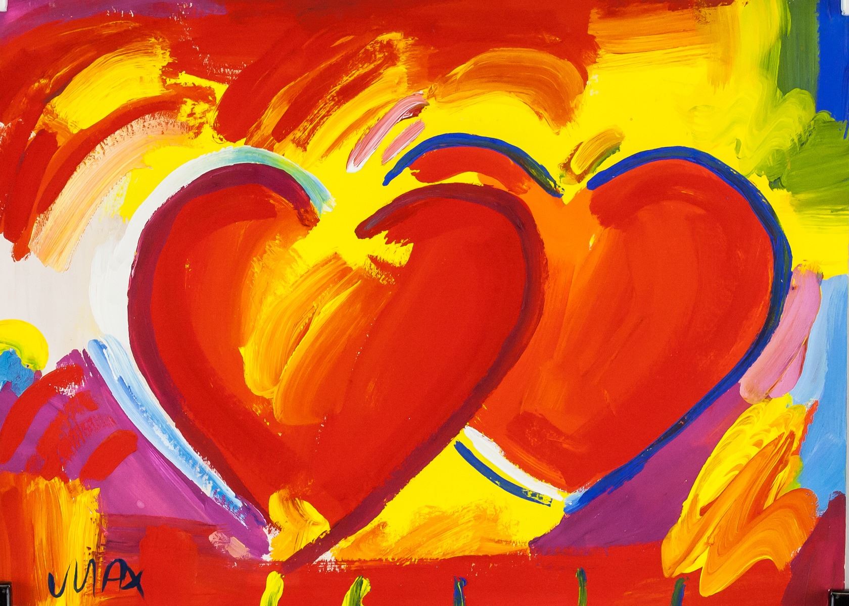 Oil on paper. Featuring two hearts. Signed MAX on the lower left corner. Stamped THE 'W' GALLERY on verso. Inscribed P. MAX #245 on verso. Attributed to Peter Max (born 1937, German). 19.5 x 27 cm (7.75 x 10.75 inches). PROVENANCE: Southern Ontario estate