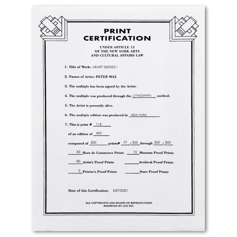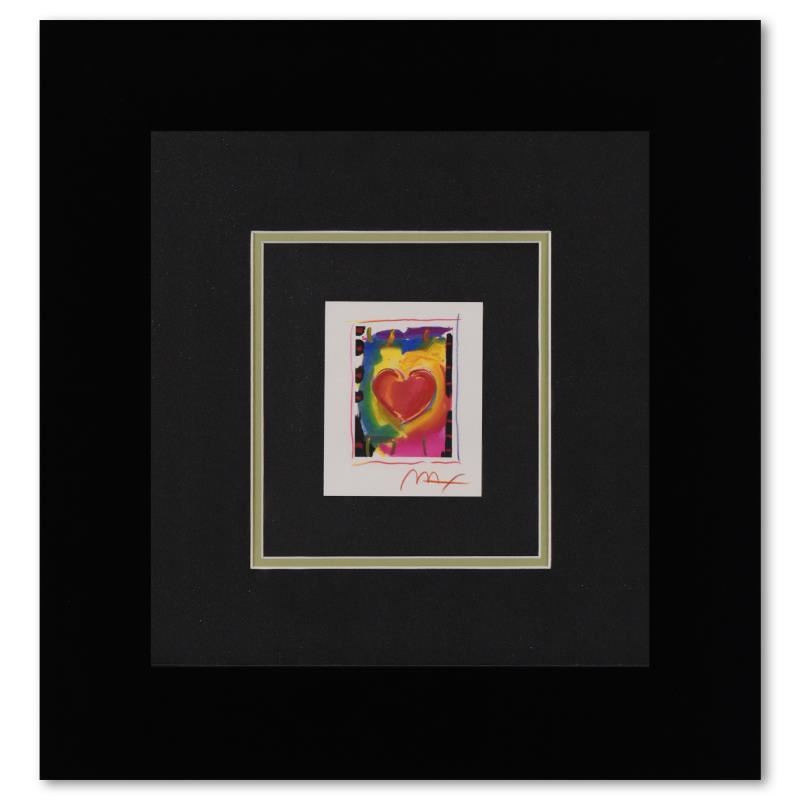 "Heart Series I" is a limited edition lithograph on paper by Peter Max, numbered 119/300 and hand signed by the artist. This piece comes framed. Includes Certificate of Authenticity from Peter Max Studios. Measures approximately 18.5" x 19.5" (frame), 4" x 5" (image).