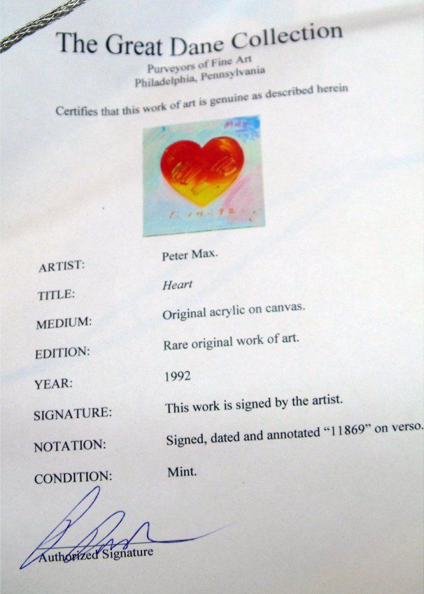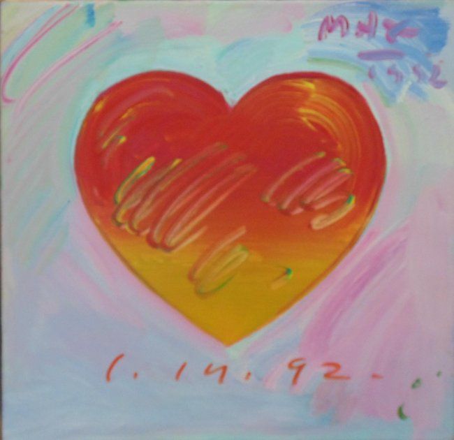 Peter Max "Heart" Original Acrylic on Canvas. Year: 1992. Signed by the artist, dated and annotated "11869" on verso. Comes with COA and unframed. WN25500