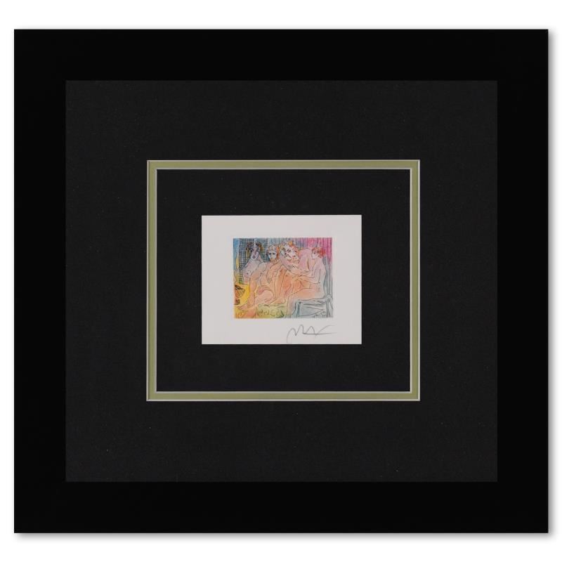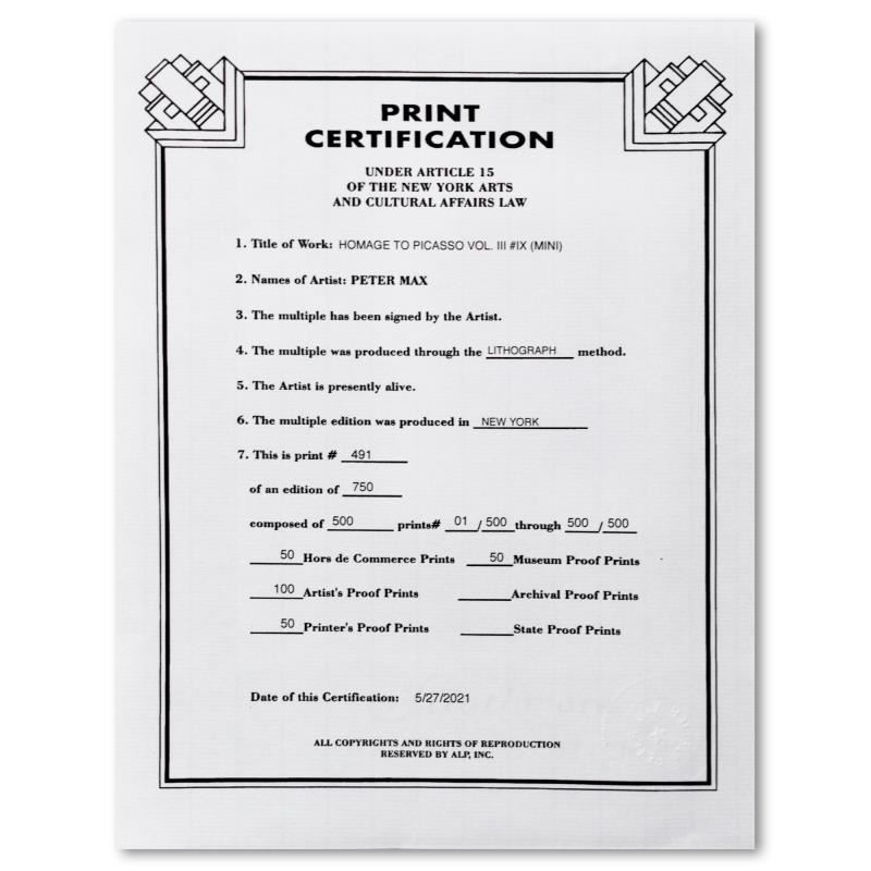 "Homage to Picasso Vol. III" is a limited edition lithograph on paper by Peter Max, numbered 491/500 and hand signed by the artist. This piece comes framed. Includes Certificate of Authenticity from Peter Max Studios. Measures approximately 17" x 16" (frame), 5" x 4" (image).