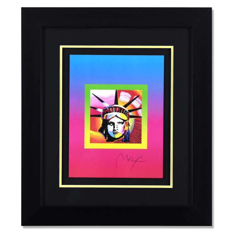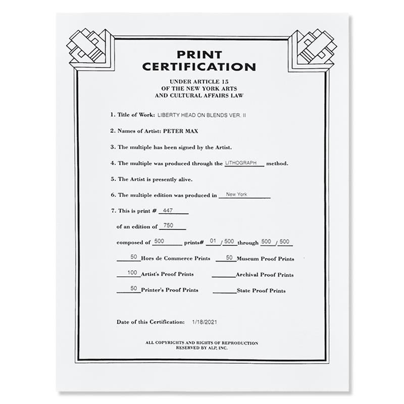 "Liberty Head on Blends Ver II" is a limited edition lithograph on paper by Peter Max, numbered 447/500 and hand signed by the artist. This piece comes framed and includes Certificate of Authenticity from Peter Max Studios. Measures approximately 30" x 26 (frame), 17" x 13" (image).