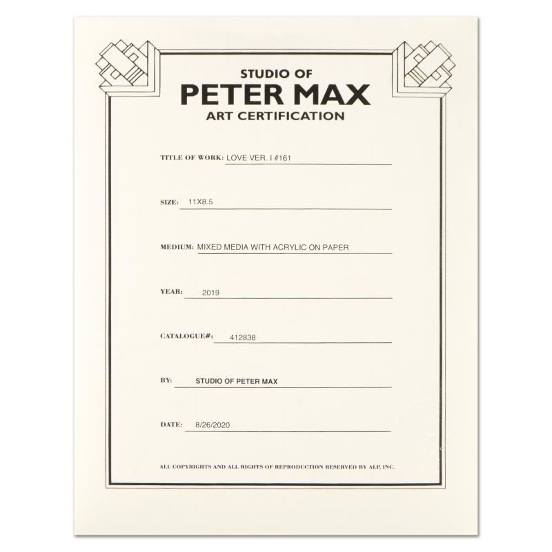 "Love" is a one-of-a-kind acrylic mixed media on paper, hand signed by Peter Max. Includes Certificate of Authenticity from Peter Max Studios. This piece comes custom framed. Measures approx. 21" x 24" (with frame), 8.5" x 11" (image).