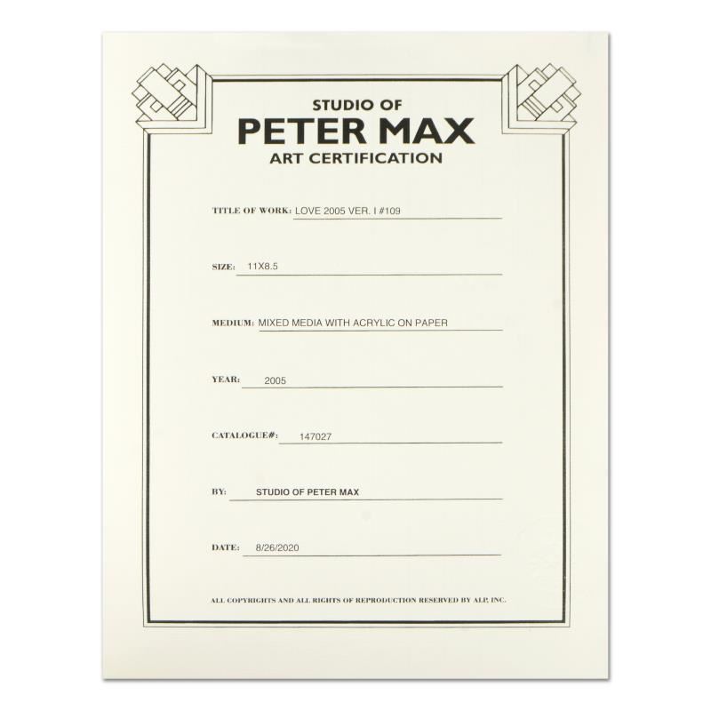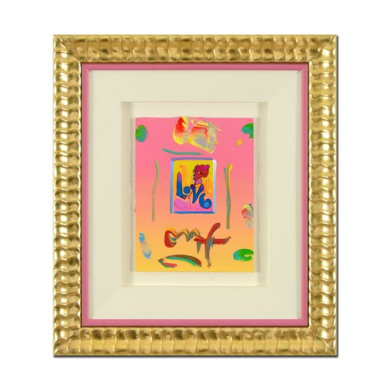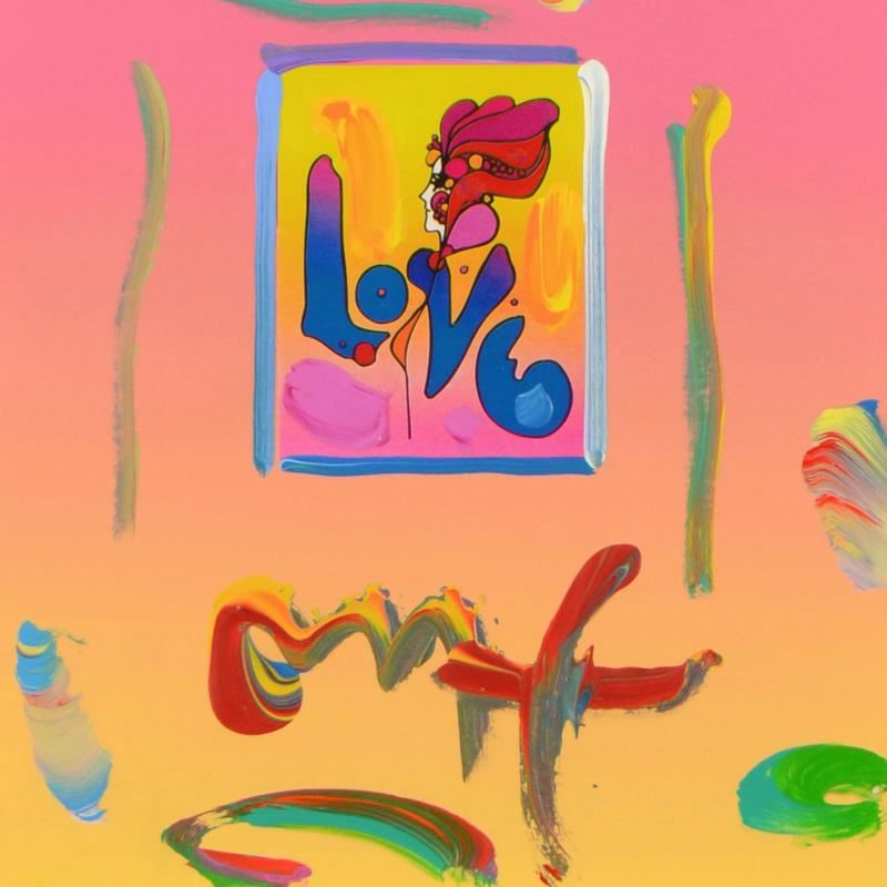 "Love" is a one-of-a-kind acrylic mixed media on paper, hand signed by Peter Max. Includes Certificate of Authenticity from Peter Max Studios. This piece comes custom framed. Measures approx. 20" x 22" (with frame), 8.5" x 11" (image).